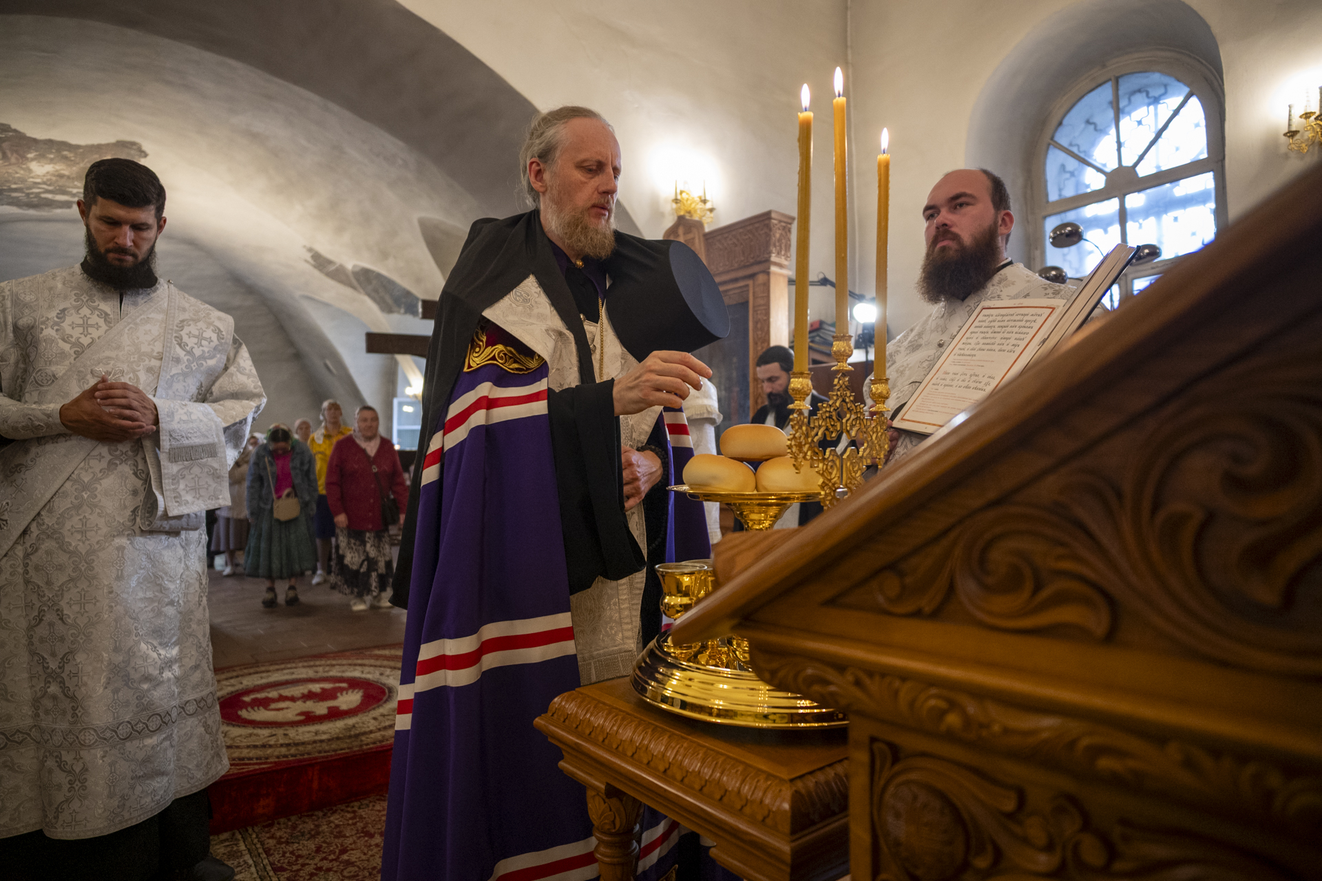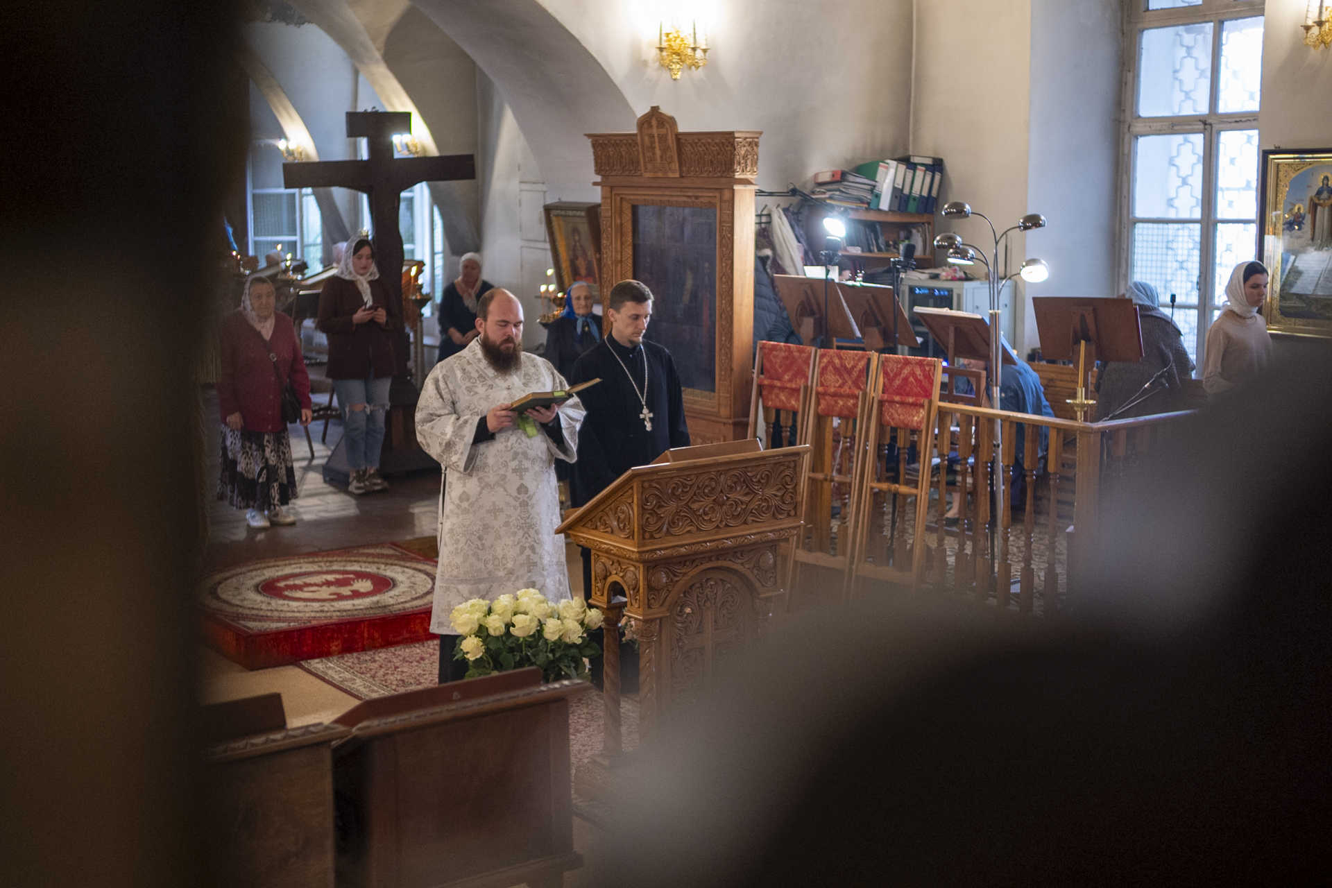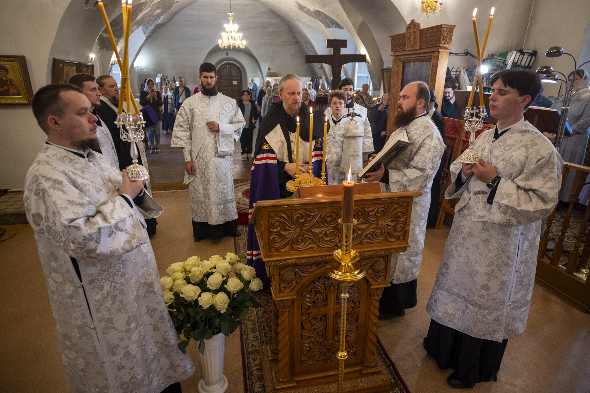 Его Преосвященству сослужили: почётный настоятель собора протоиерей Андрей Кульков, настоятель собора протоиерей Алексей Морозов, священник Алексей Талалаев, диакон Алексей Герасимов, диакон Сергий Танчинец.
