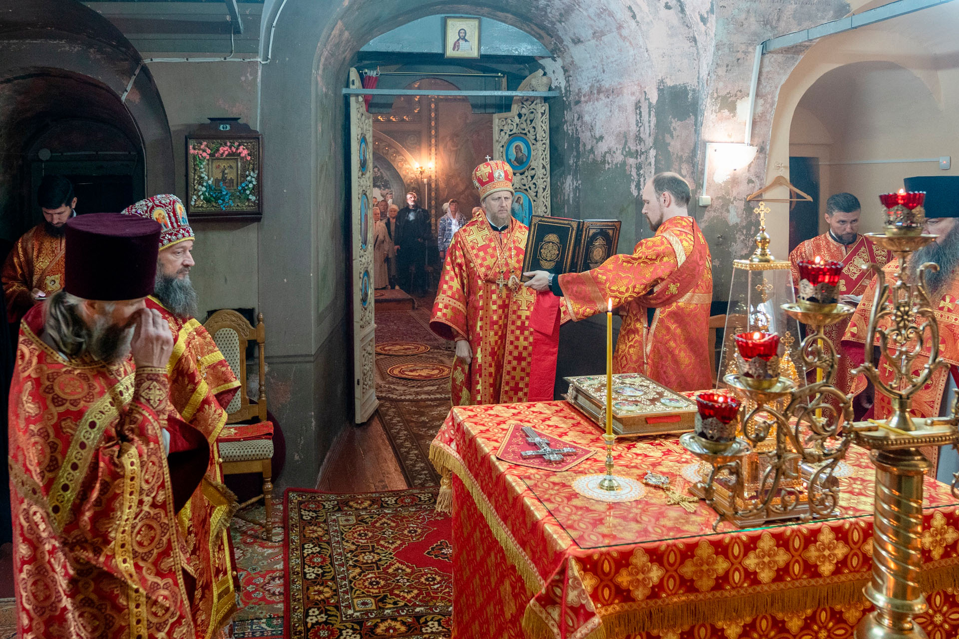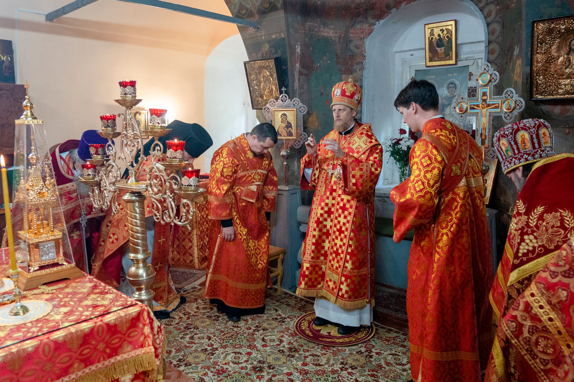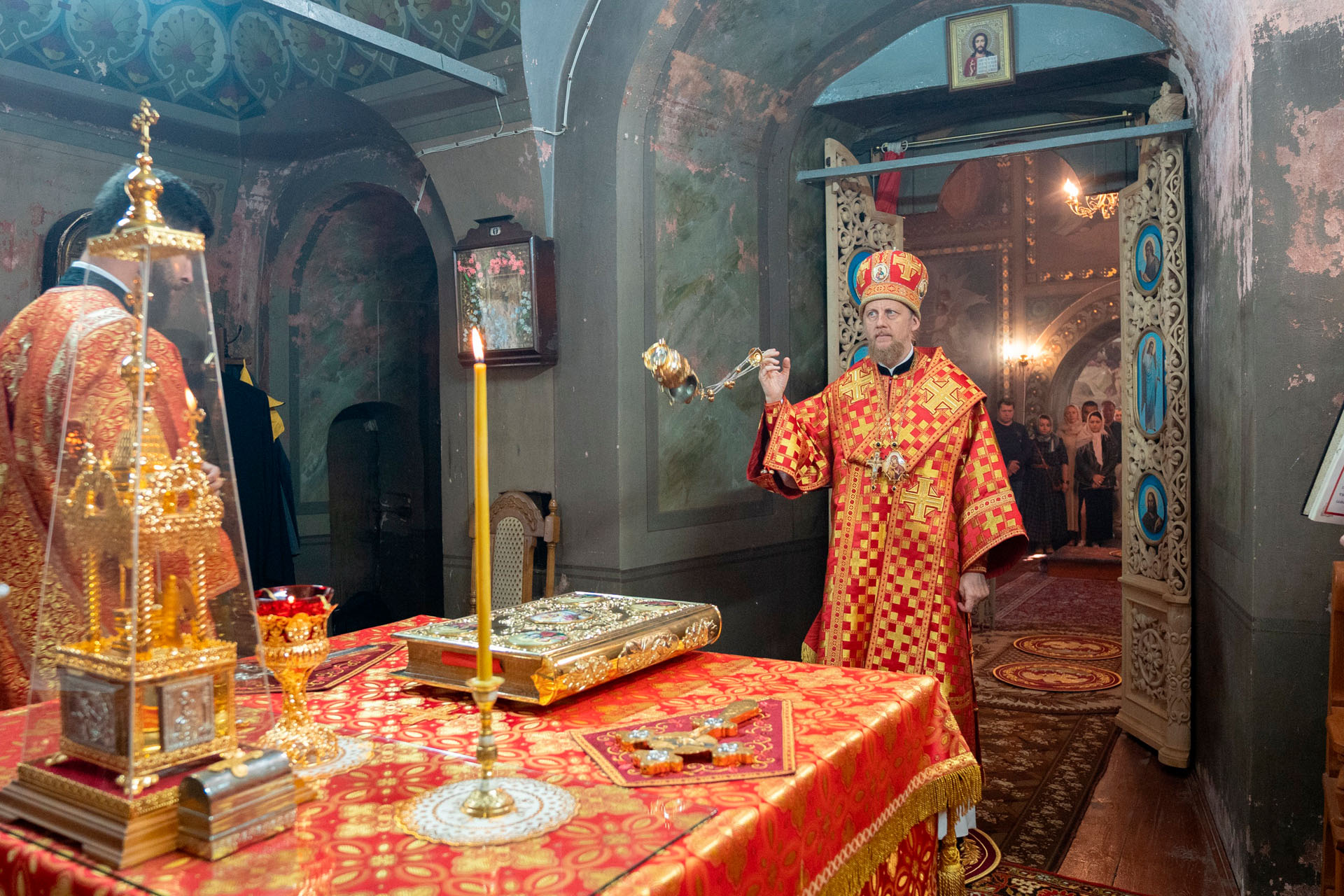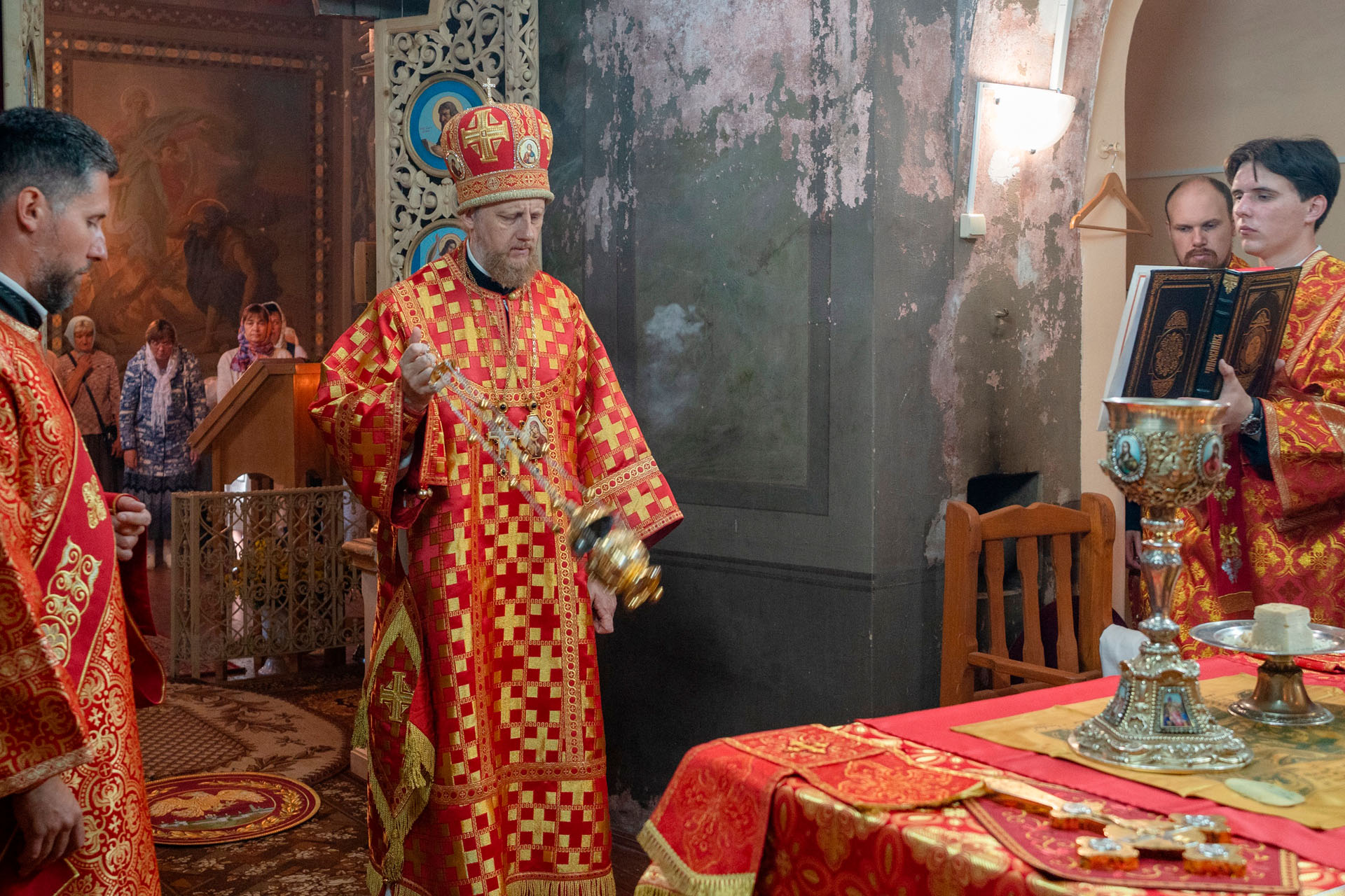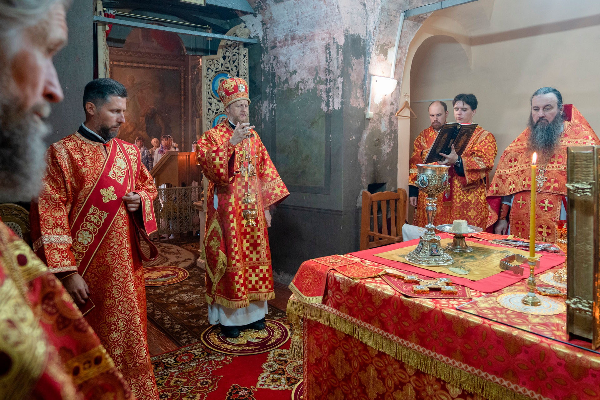 Его Преосвященству сослужили: секретарь Переславского епархиального управления протоиерей Александр Передернин, благочинный Угличского округа игумен Николай (Шишкин), настоятель храма протоиерей Борис Стародубов, благочинный Мышкинского округа протоиерей Александр Иванов, диакон Алексей Герасимов, диакон Олег Юрков.