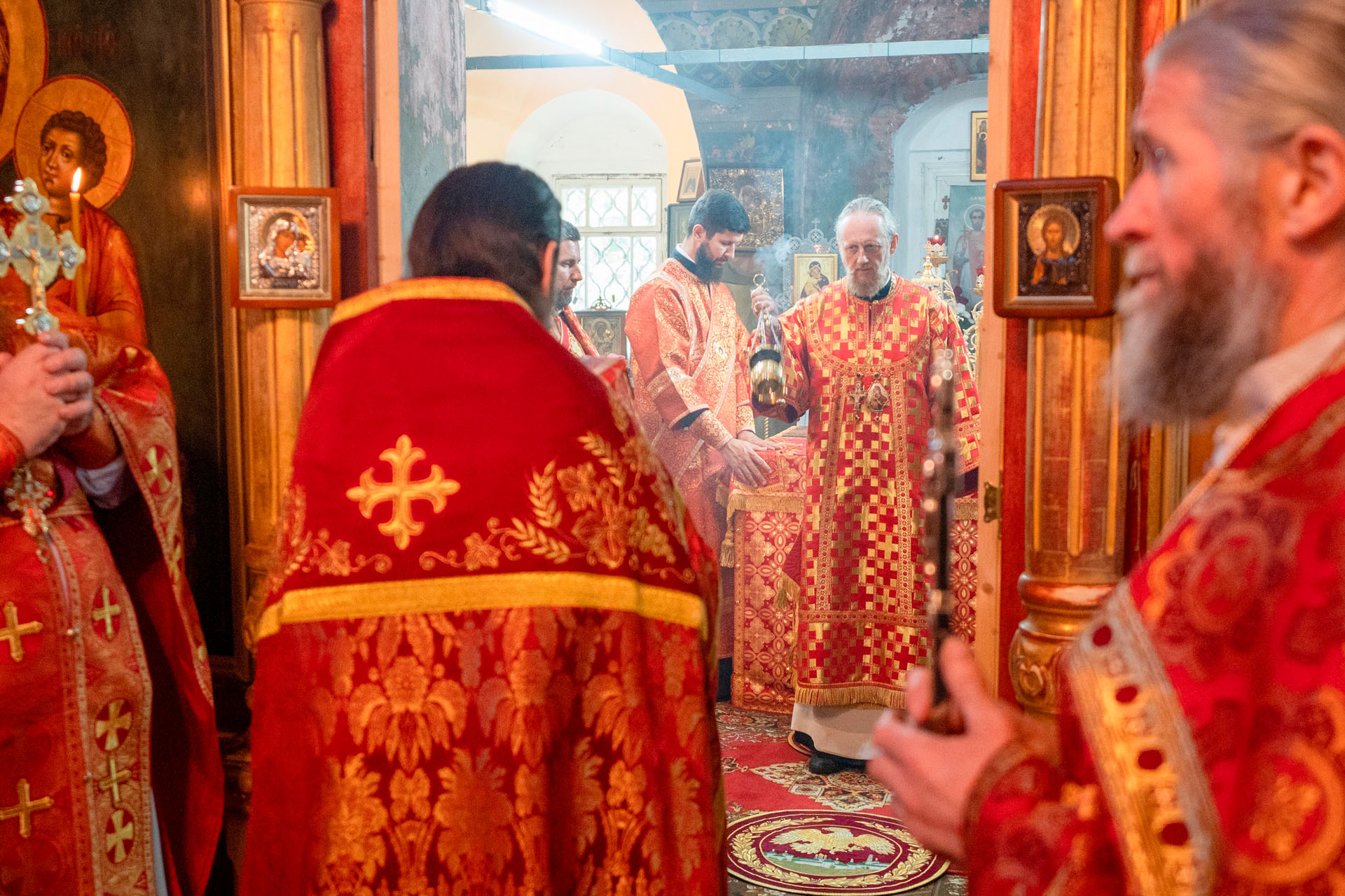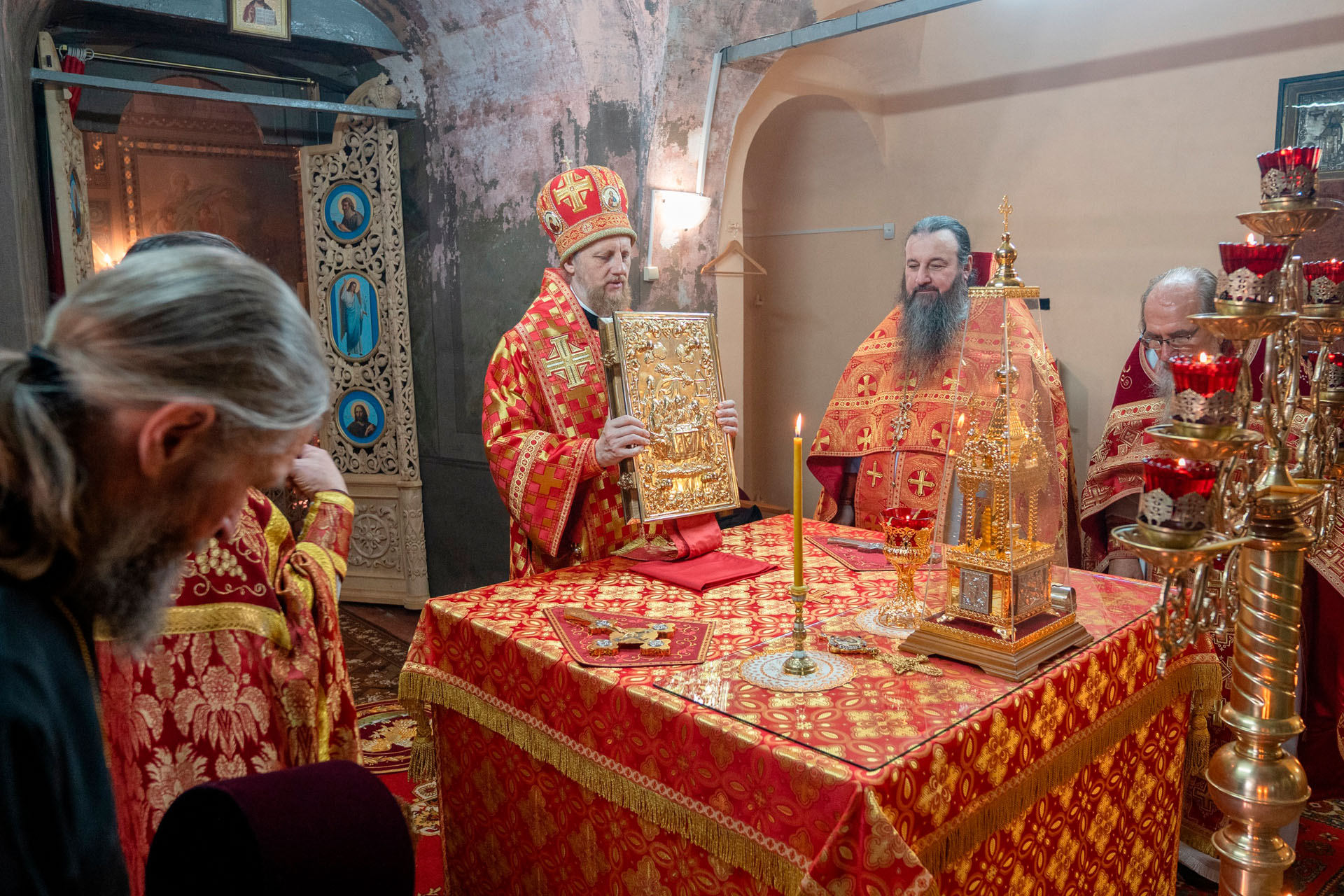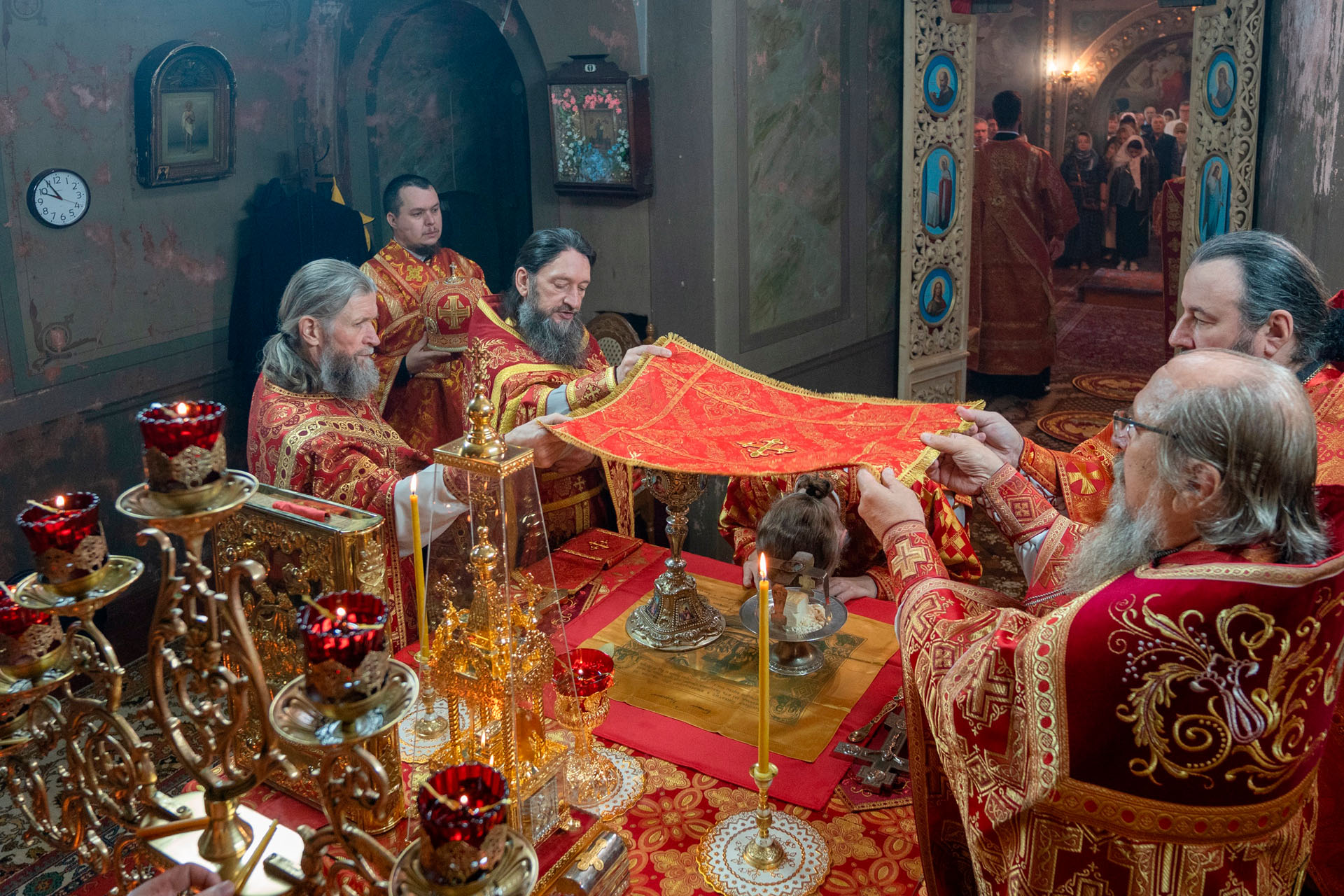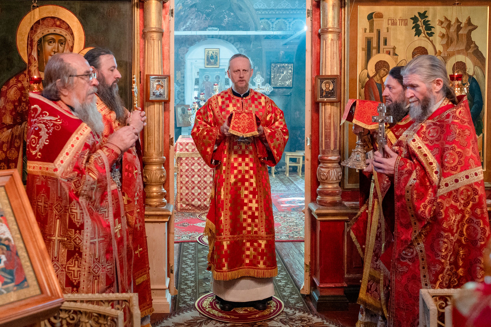 Его Преосвященству сослужили: секретарь Переславского епархиального управления протоиерей Александр Передернин, благочинный Угличского округа игумен Николай (Шишкин), настоятель храма протоиерей Борис Стародубов, благочинный Мышкинского округа протоиерей Александр Иванов, диакон Алексей Герасимов, диакон Олег Юрков.