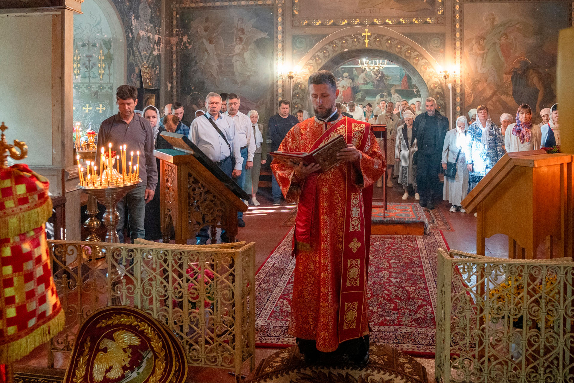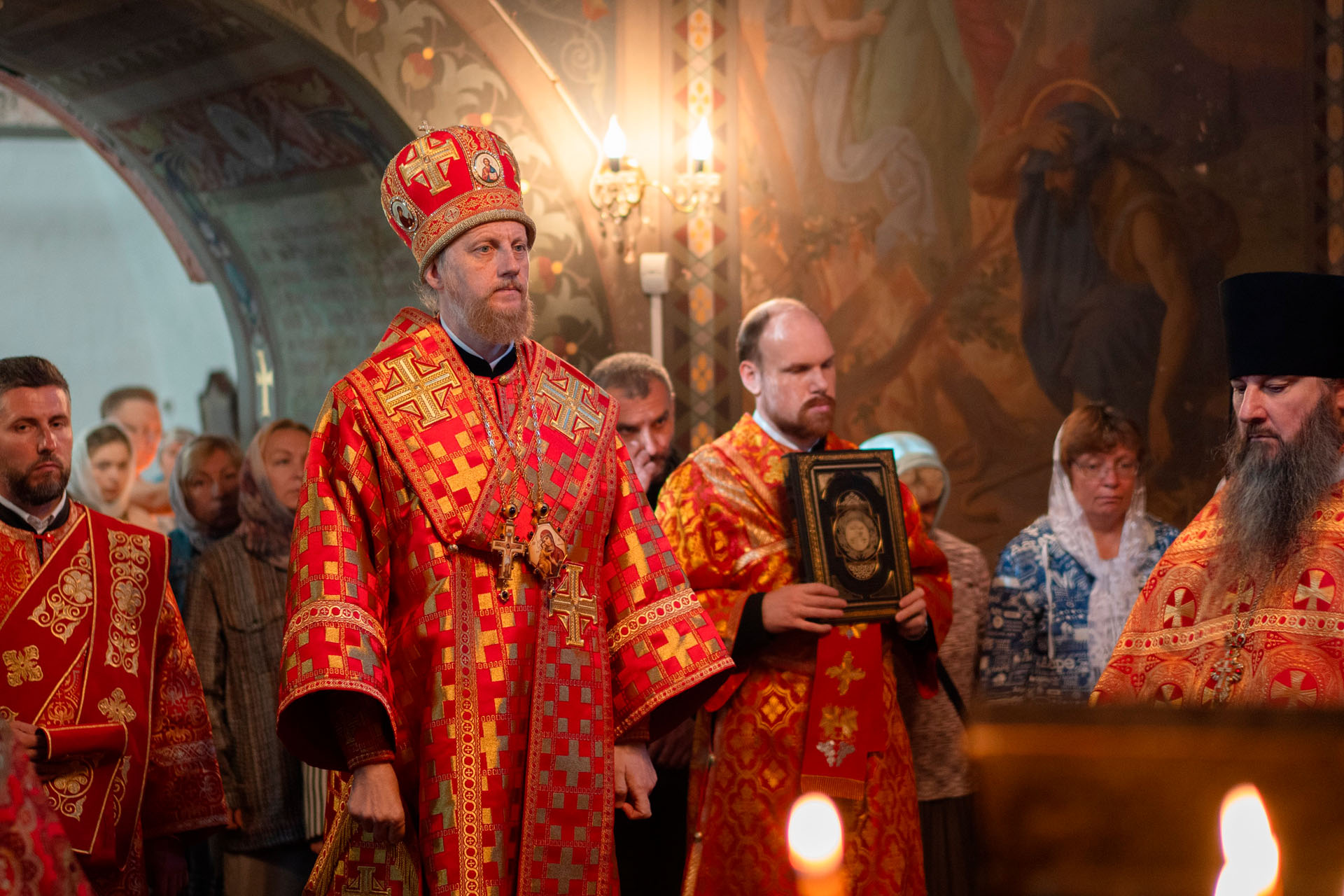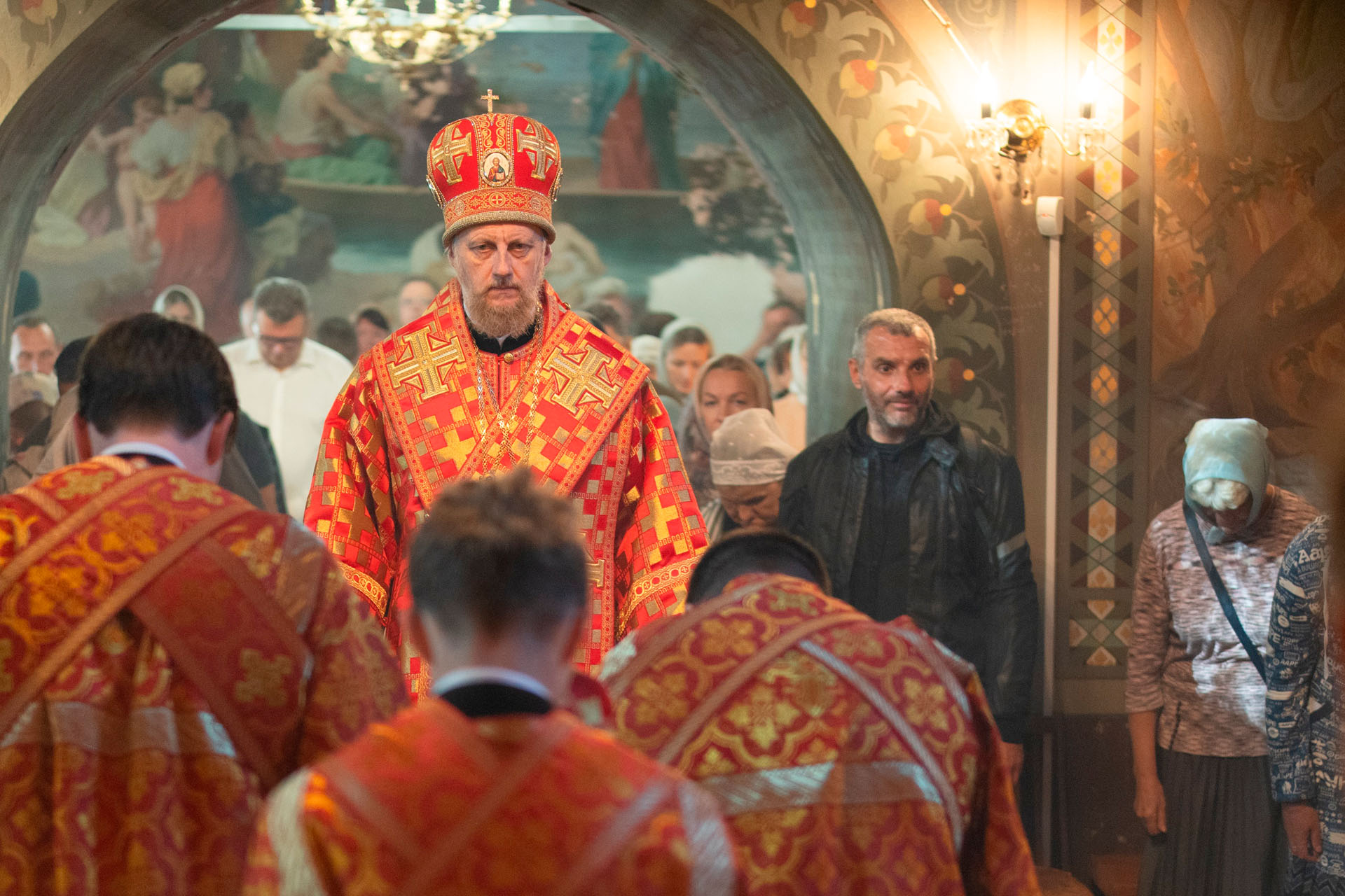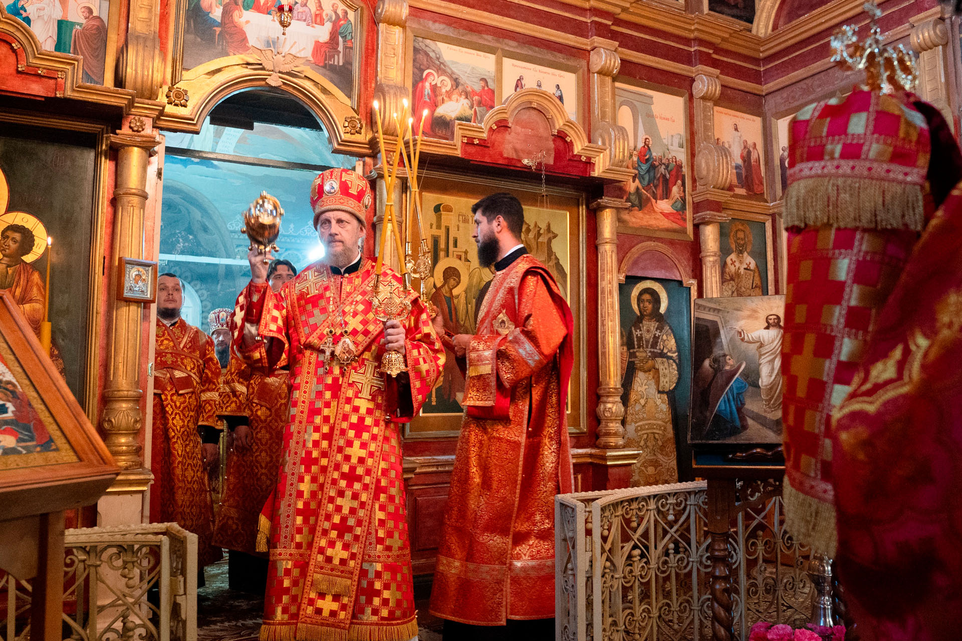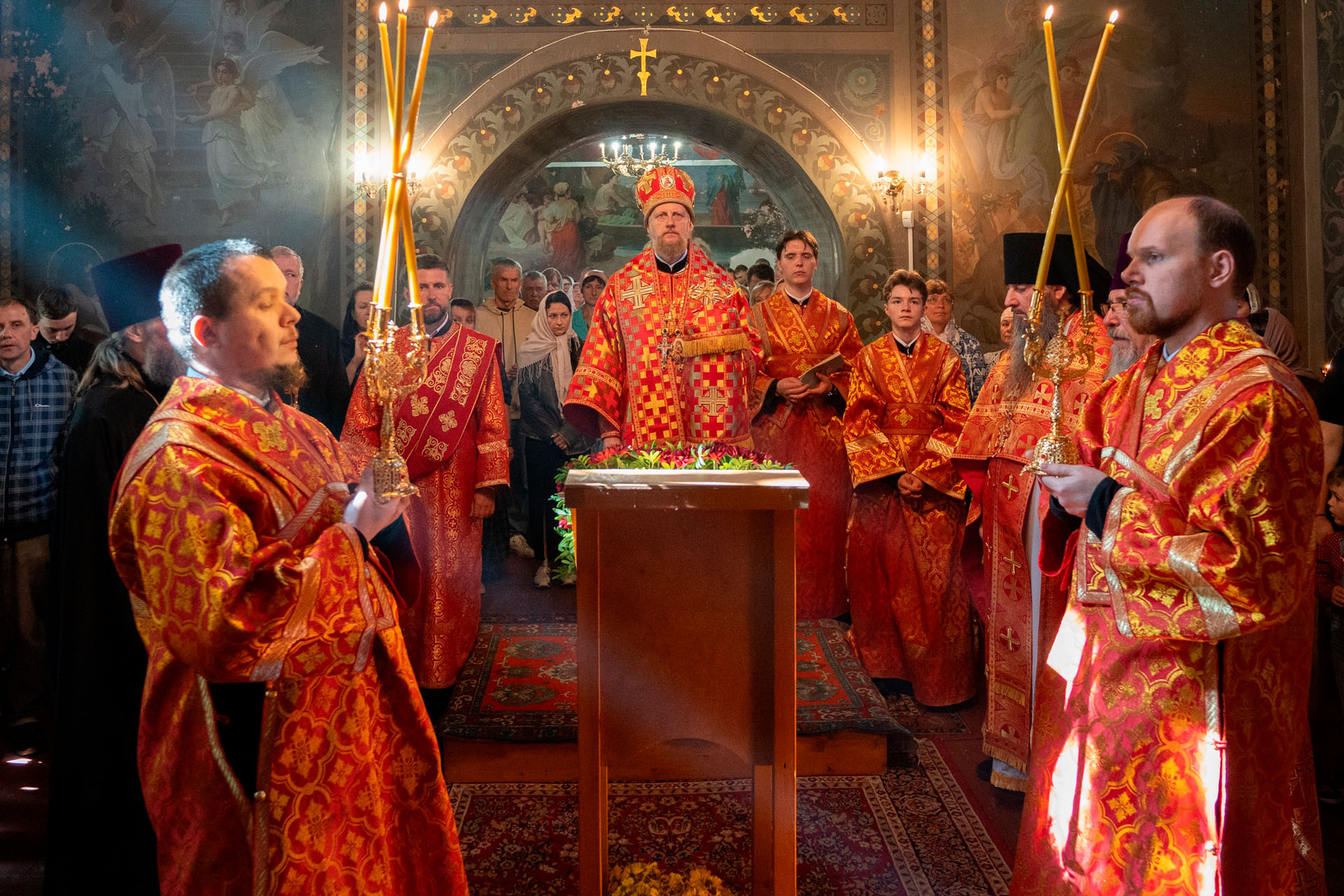 Его Преосвященству сослужили: секретарь Переславского епархиального управления протоиерей Александр Передернин, благочинный Угличского округа игумен Николай (Шишкин), настоятель храма протоиерей Борис Стародубов, благочинный Мышкинского округа протоиерей Александр Иванов, диакон Алексей Герасимов, диакон Олег Юрков.