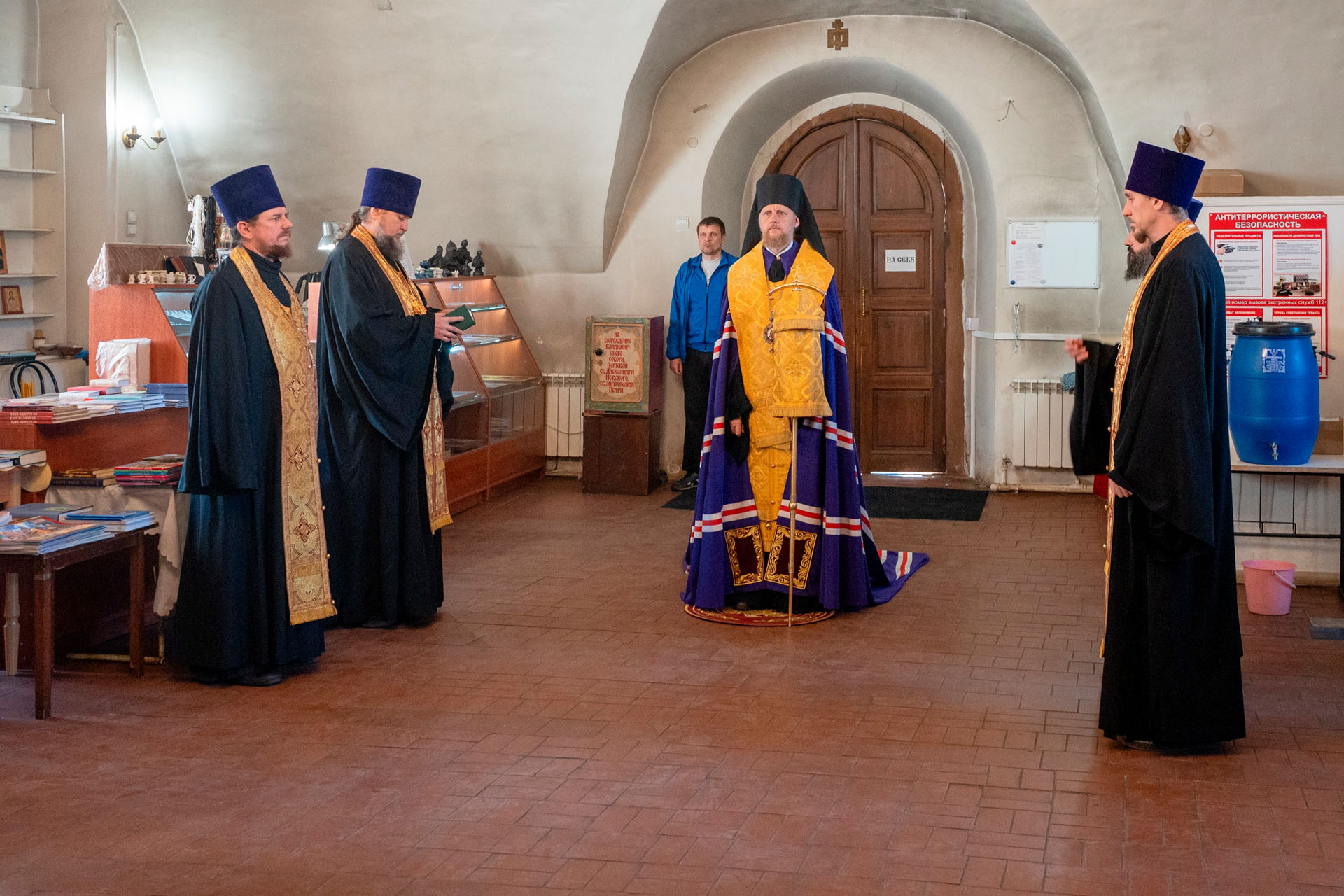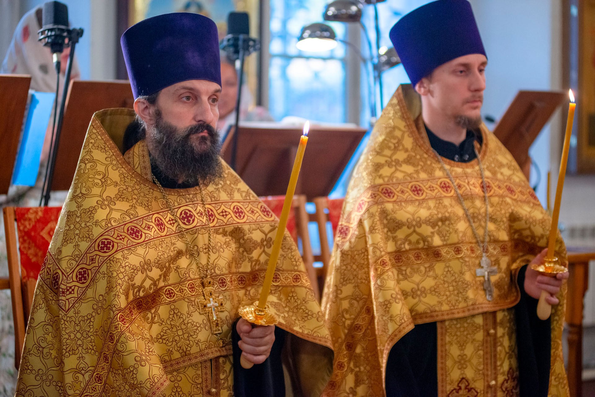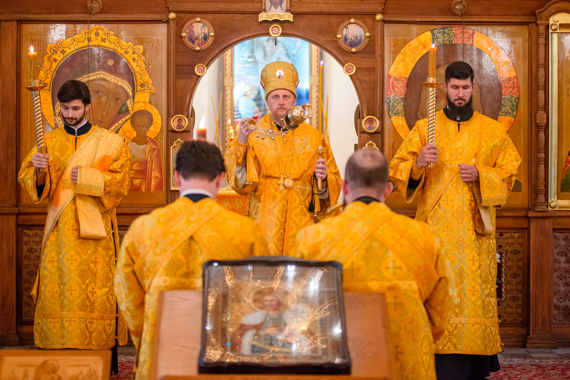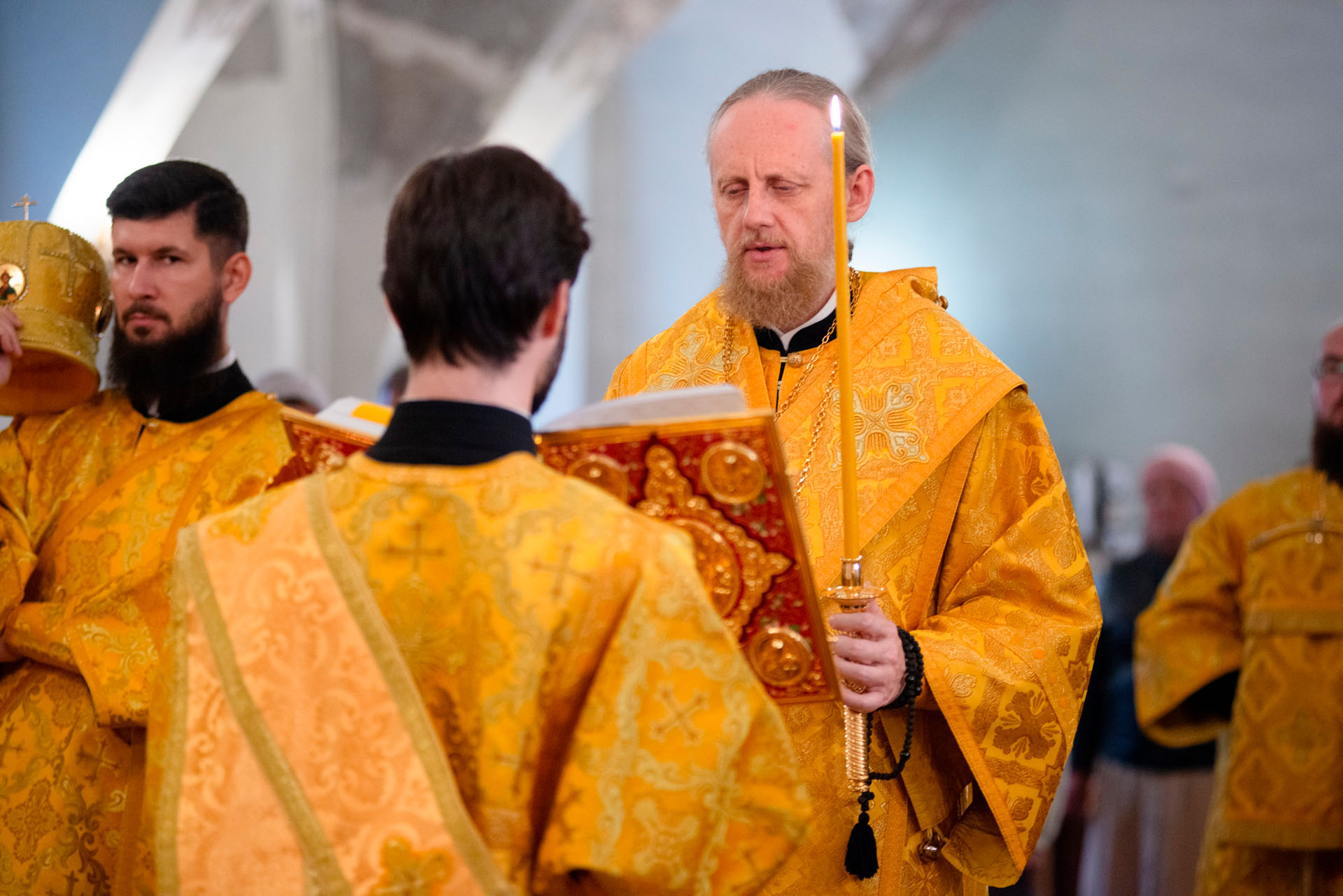 Его Преосвященству сослужили: почётный настоятель собора протоиерей Андрей Кульков, настоятель собора протоиерей Алексей Морозов, священник Василий Молоток, священник Алексей Талалаев, диакон Алексей Герасимов, диакон Сергий Танчинец.