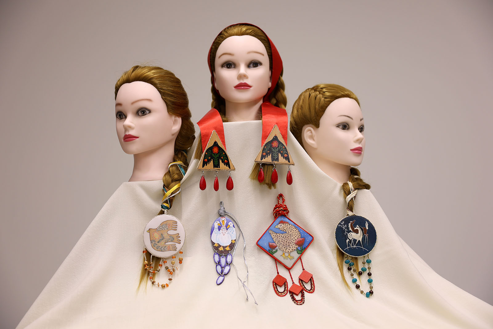 Итогом работы Ксении стали пять накосников, каждый из которых выполнен в своей технике: роспись по дереву, роспись по ткани в технике батик, декор бусинами и бисером, использование лент, шнура и сутажа, комбинированные техники.