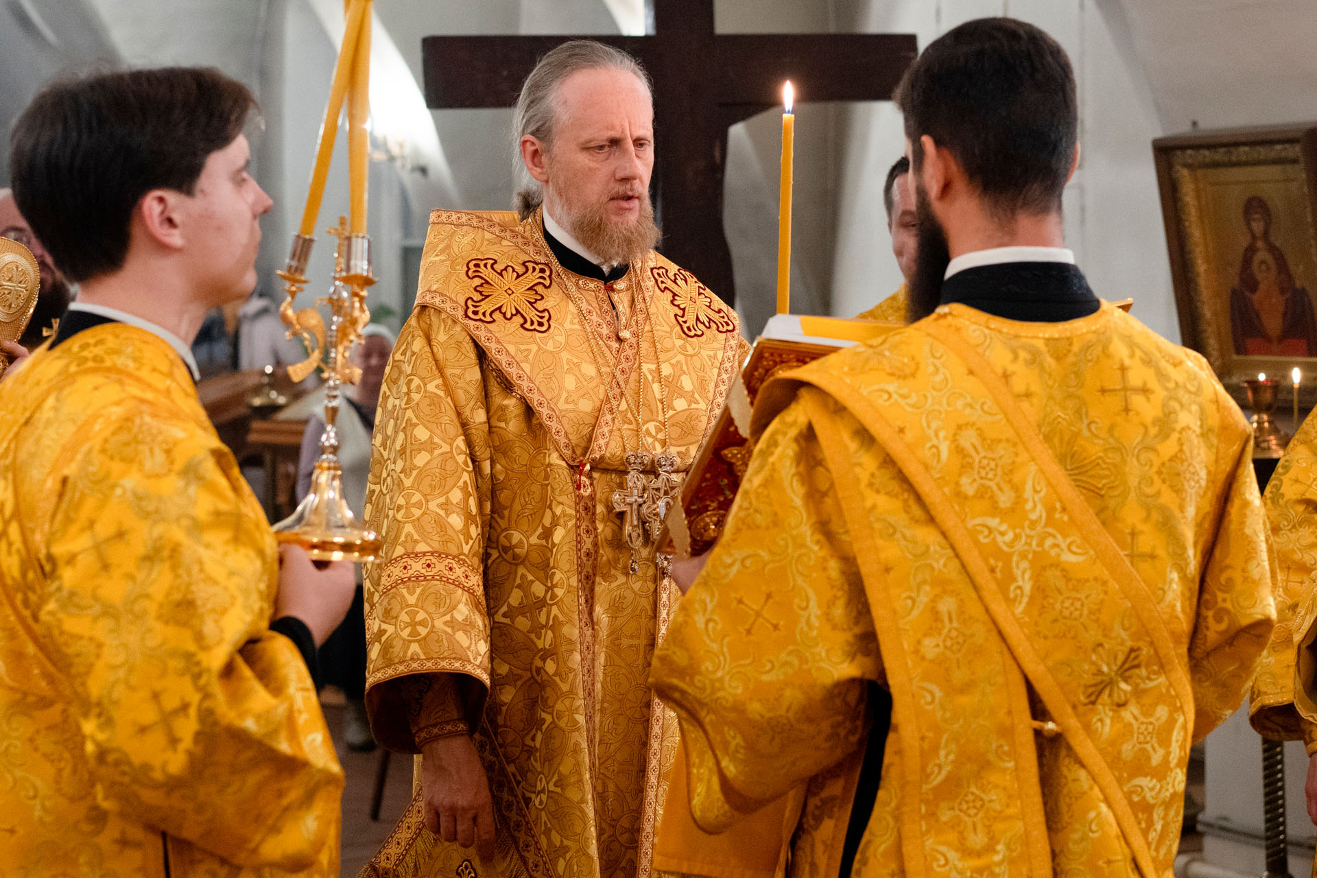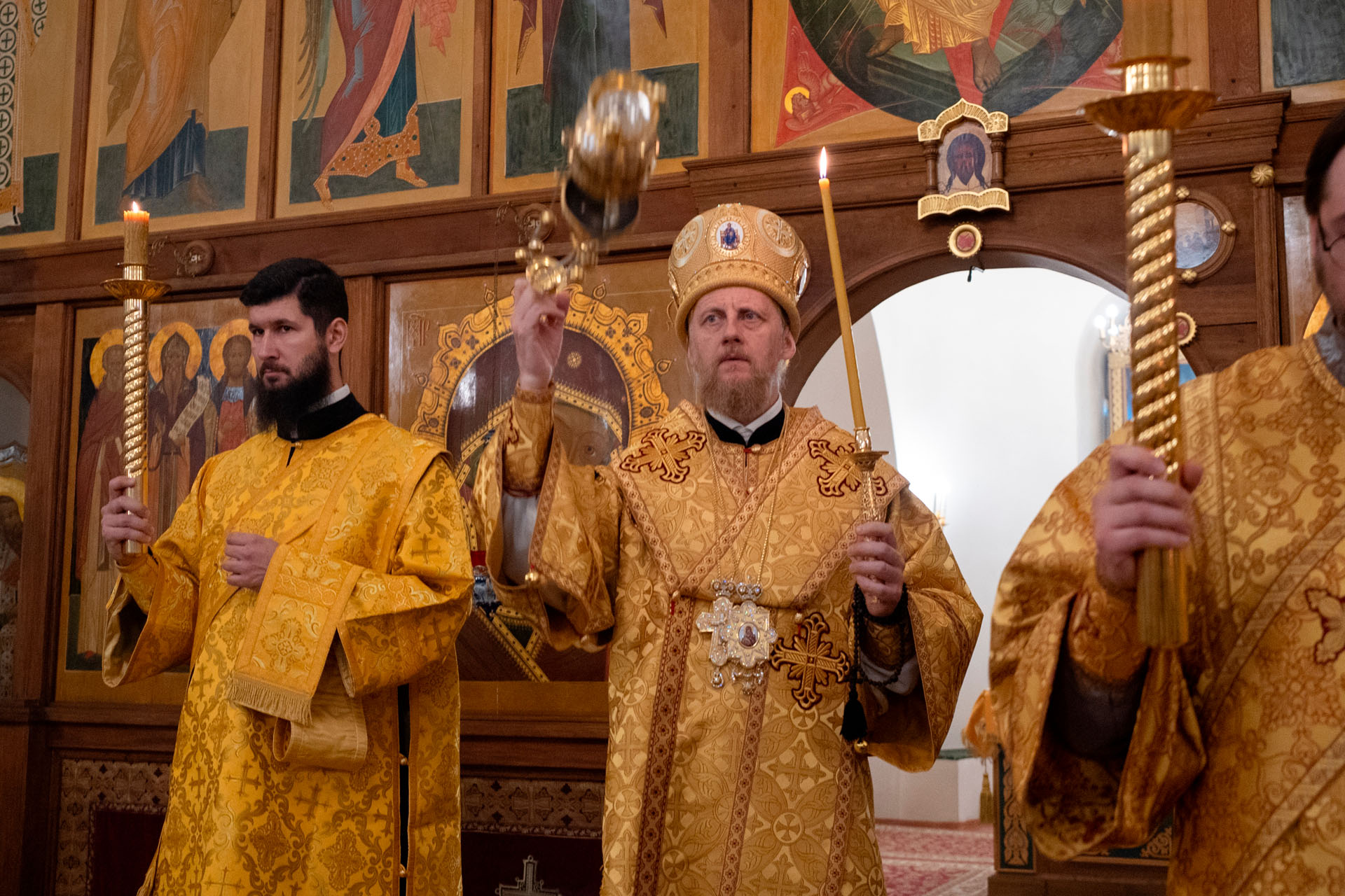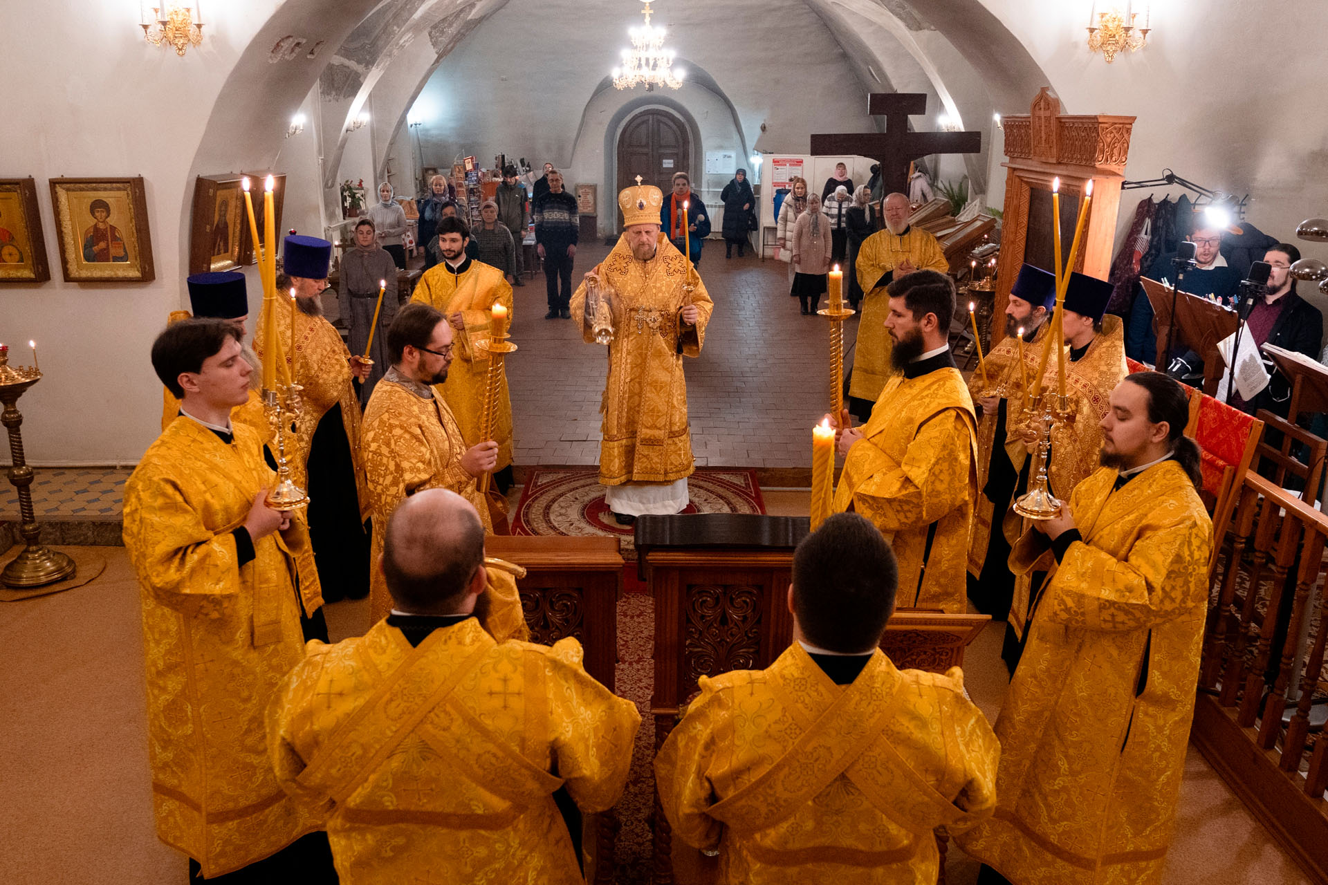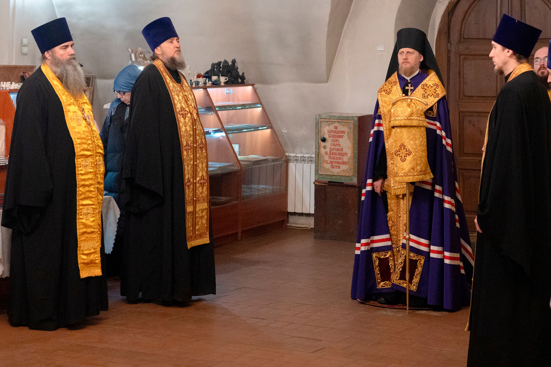 Его Преосвященству сослужили: почётный настоятель собора протоиерей Андрей Кульков, настоятель собора протоиерей Алексей Морозов, протоиерей Андрей Уфимцев, священник Алексей Талалаев, диакон Владимир Принёв, диакон Алексей Герасимов, диакон Сергий Танчинец.