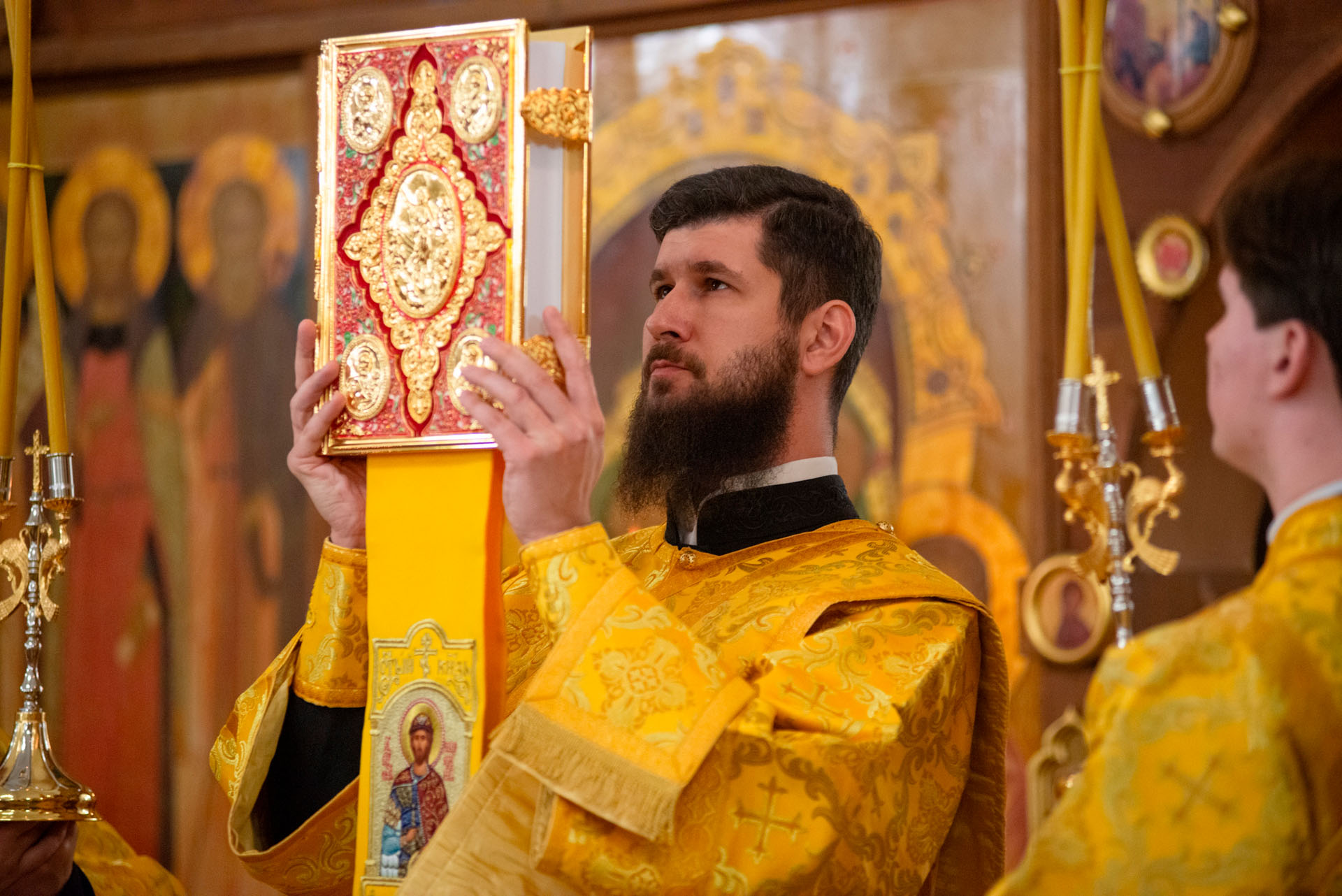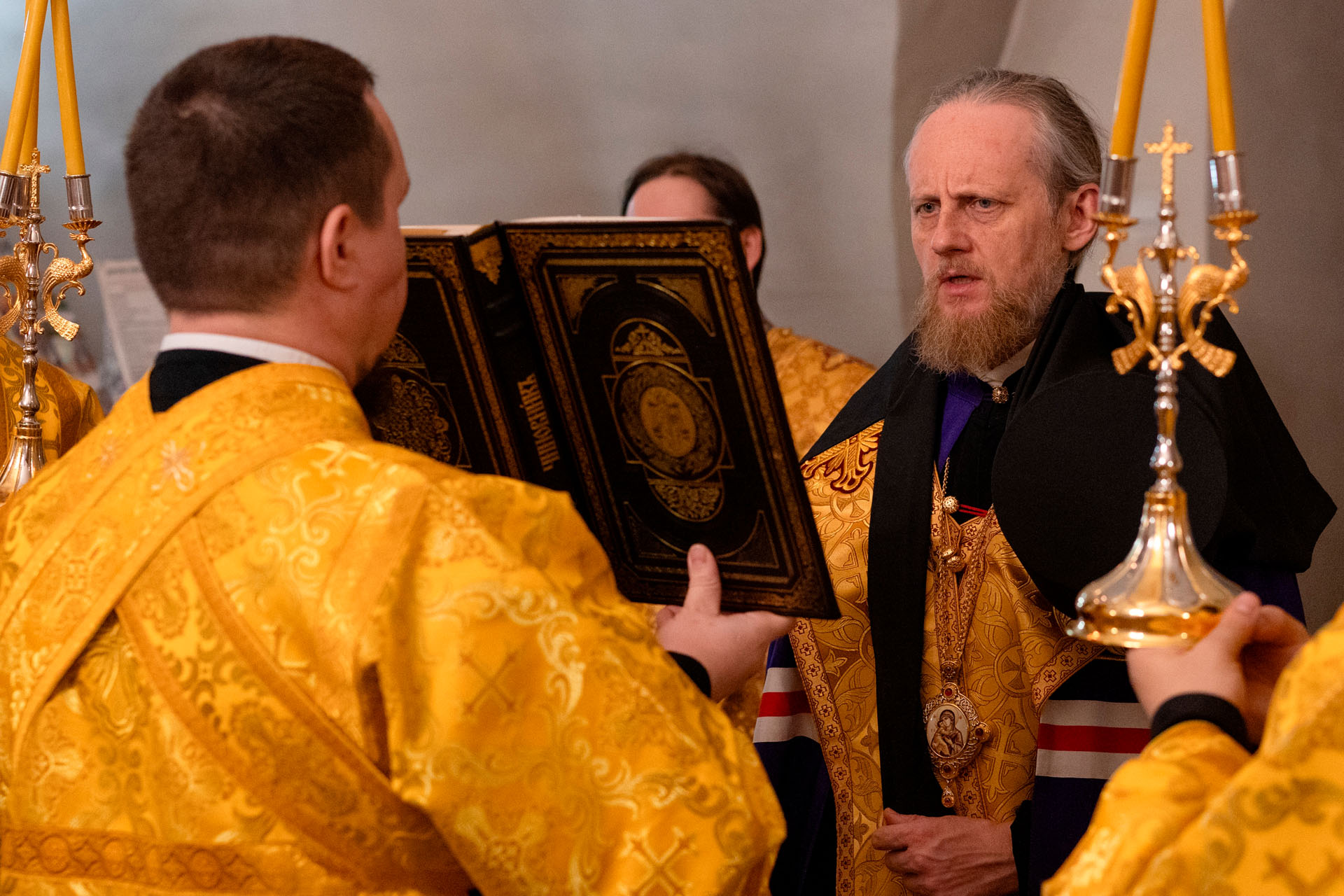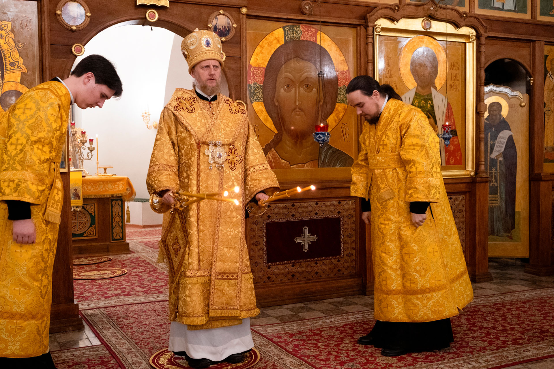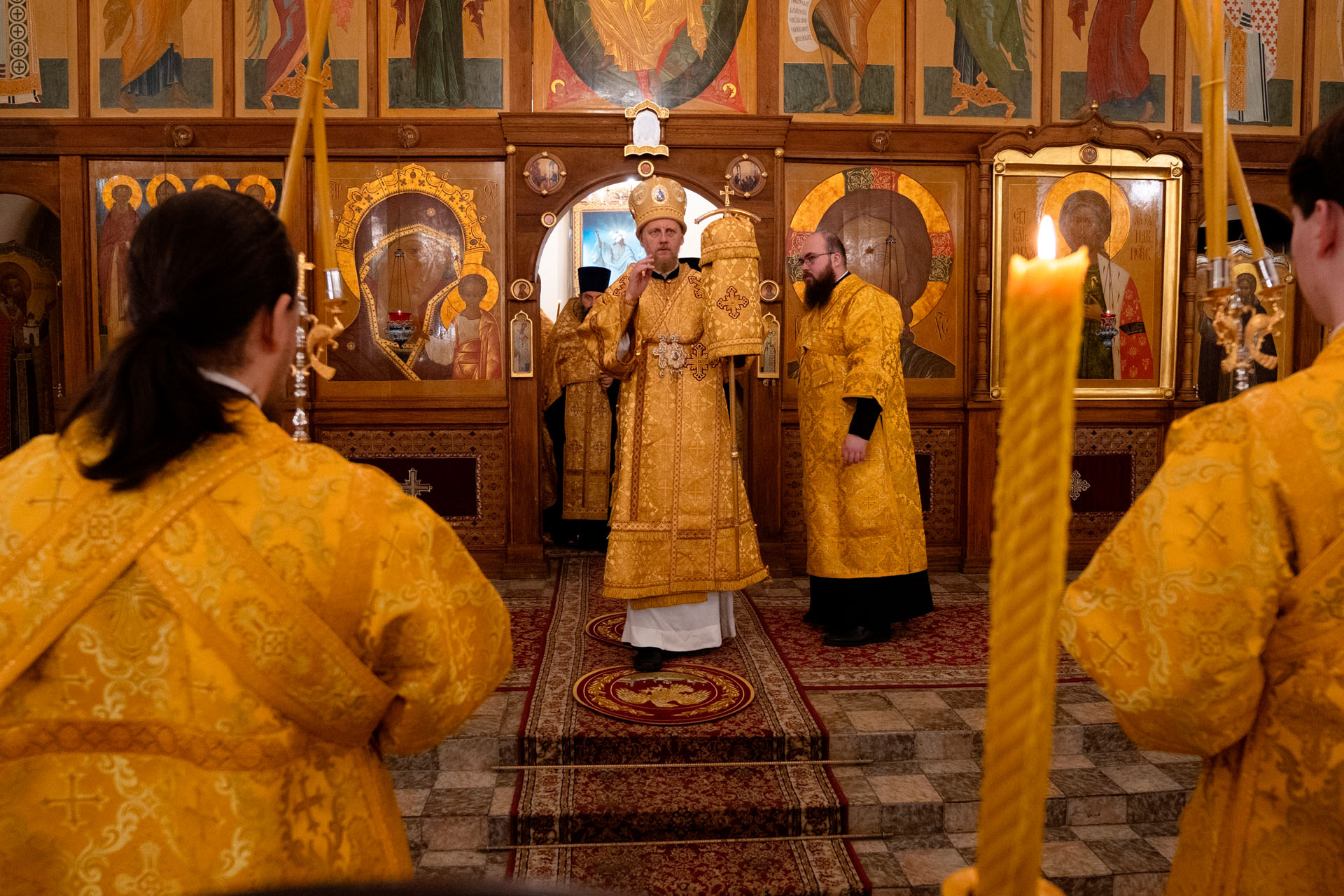 Его Преосвященству сослужили: почётный настоятель собора протоиерей Андрей Кульков, настоятель собора протоиерей Алексей Морозов, протоиерей Андрей Уфимцев, священник Алексей Талалаев, диакон Владимир Принёв, диакон Алексей Герасимов, диакон Сергий Танчинец.