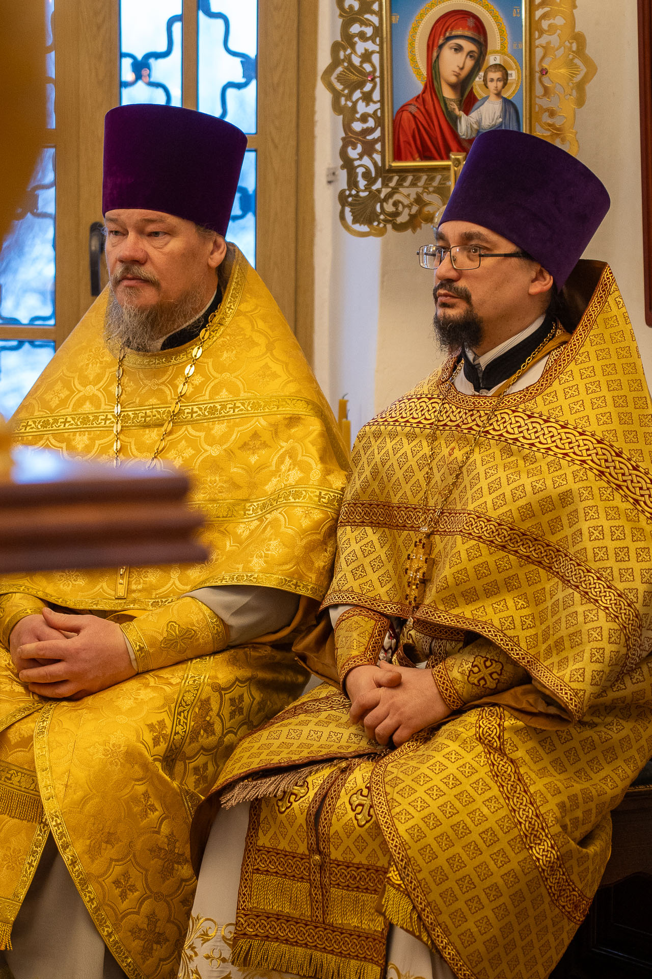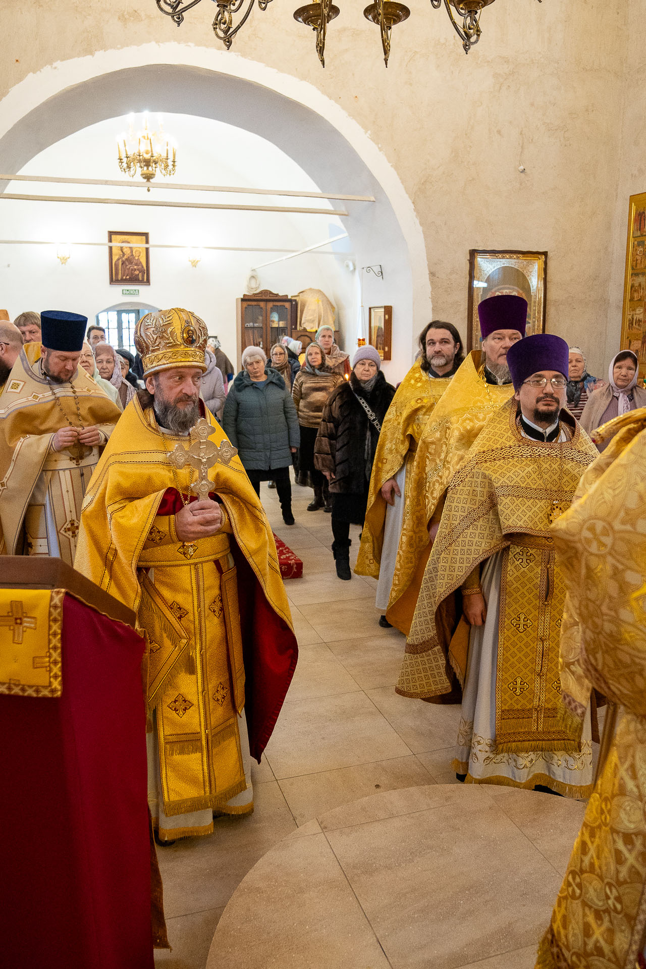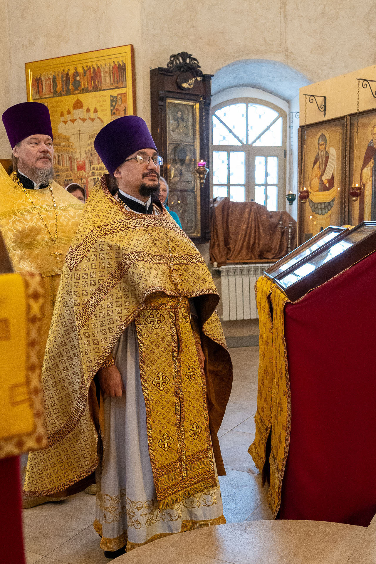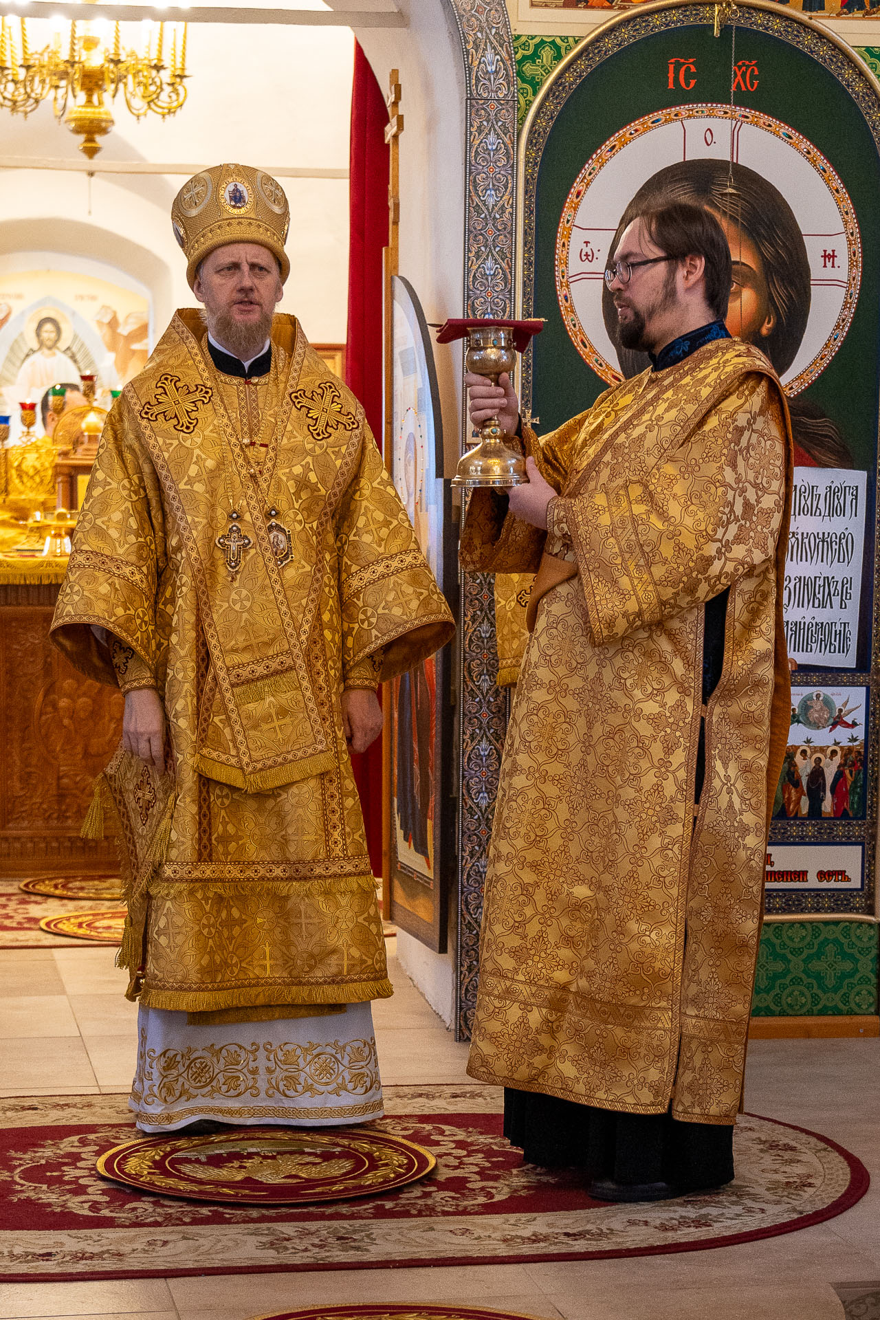 Его Преосвященству сослужили: секретарь Переславского епархиального управления протоиерей Александр Передернин, настоятель храма священник Виталий Сышев, протоиерей Михаил Лазарев, благочинный Плещеевского округа священник Олег Калинкин, священник Кирилл Филатов, священник Александр Востродымов, диакон Владимир Принёв, диакон Алексей Герасимов, диакон Димитрий Ухоботов.