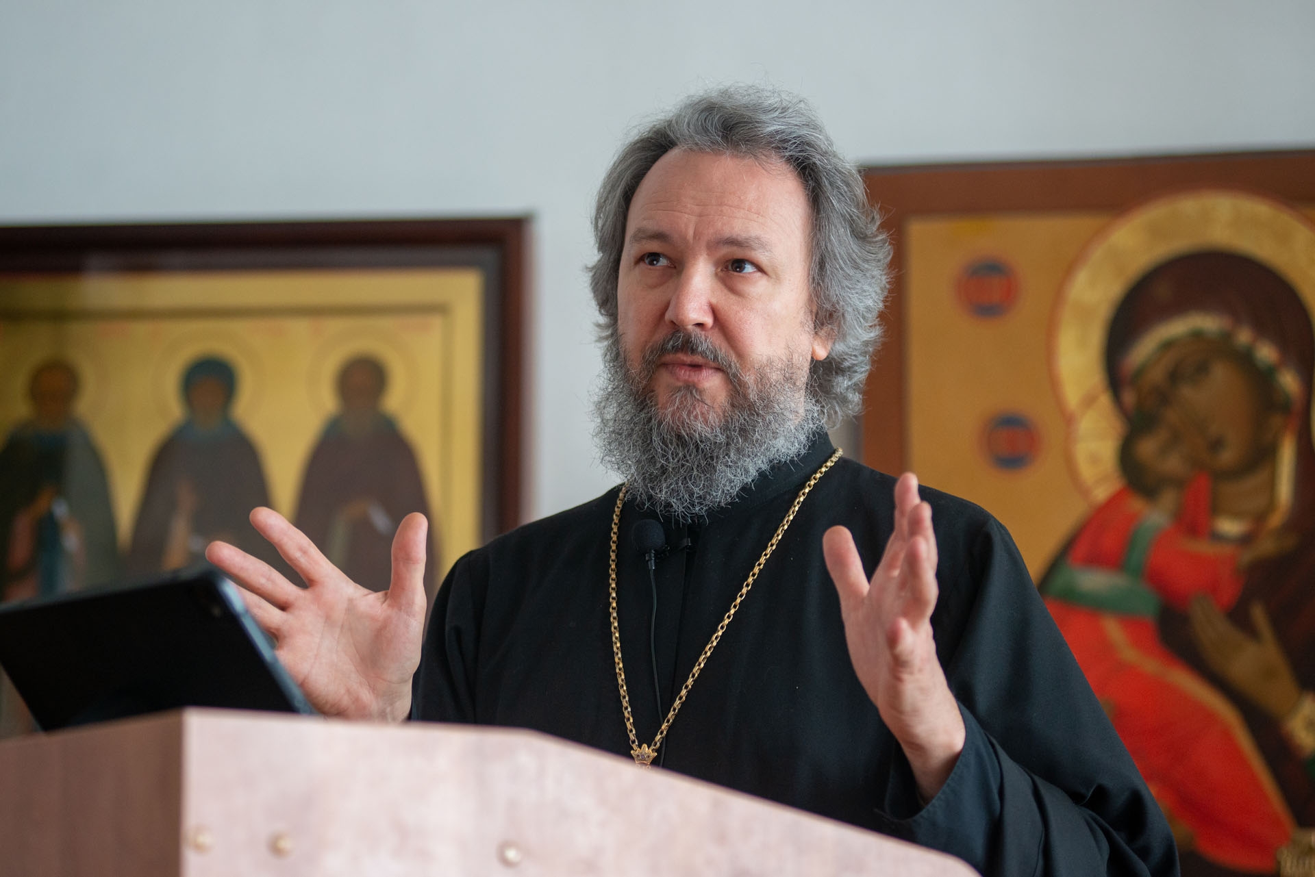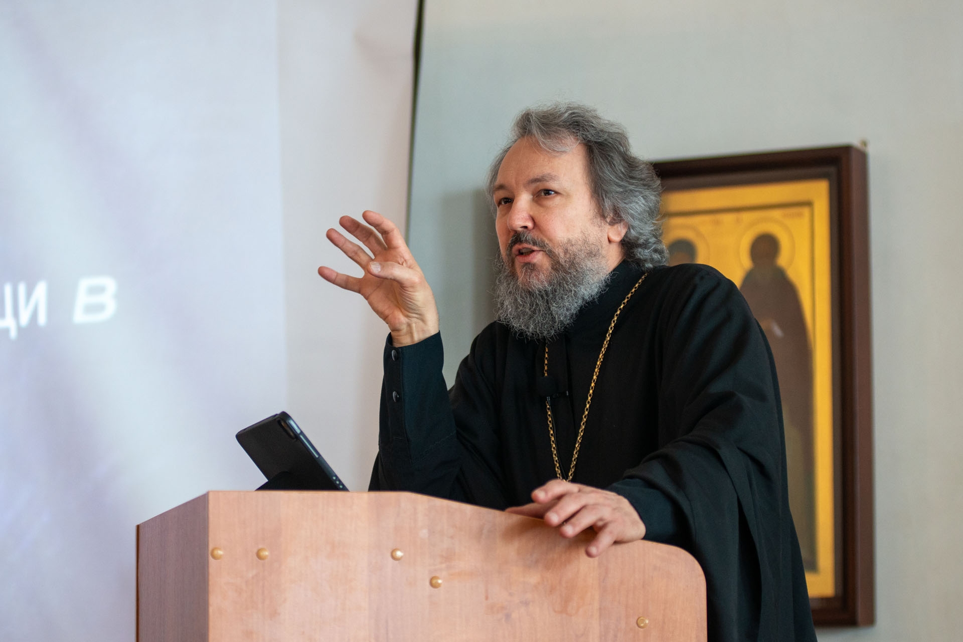 В своём выступлении он рассказал о ключевых принципах поддержки военнослужащих и их семей, коснувшись психологических последствий участия в боевых действиях. Священник отметил, что несмотря на невоцерковленность армии, потребность в духовной опоре сохраняется. Он сообщил, что в пастырской практике встречаются обращения по широкому кругу вопросов, включая социальные и юридические, что требует перенаправления к профильным организациям. Отец Илья подчеркнул важность деликатного отношения к ветеранам, обратил внимание на трудности их адаптации к мирной жизни, включая посттравматические расстройства, и осветил вопросы пастырского сопровождения в ситуациях горя, в том числе при общении с детьми. В заключение он указал на необходимость крайней осторожности и индивидуального подхода в этой работе.