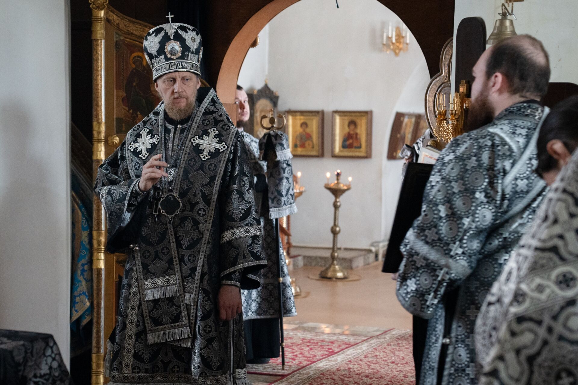 Его Преосвященству сослужили: почётный настоятель собора протоиерей Андрей Кульков, настоятель собора протоиерей Алексей Морозов, диакон Владимир Принёв, диакон Алексей Герасимов, диакон Сергий Танчинец.