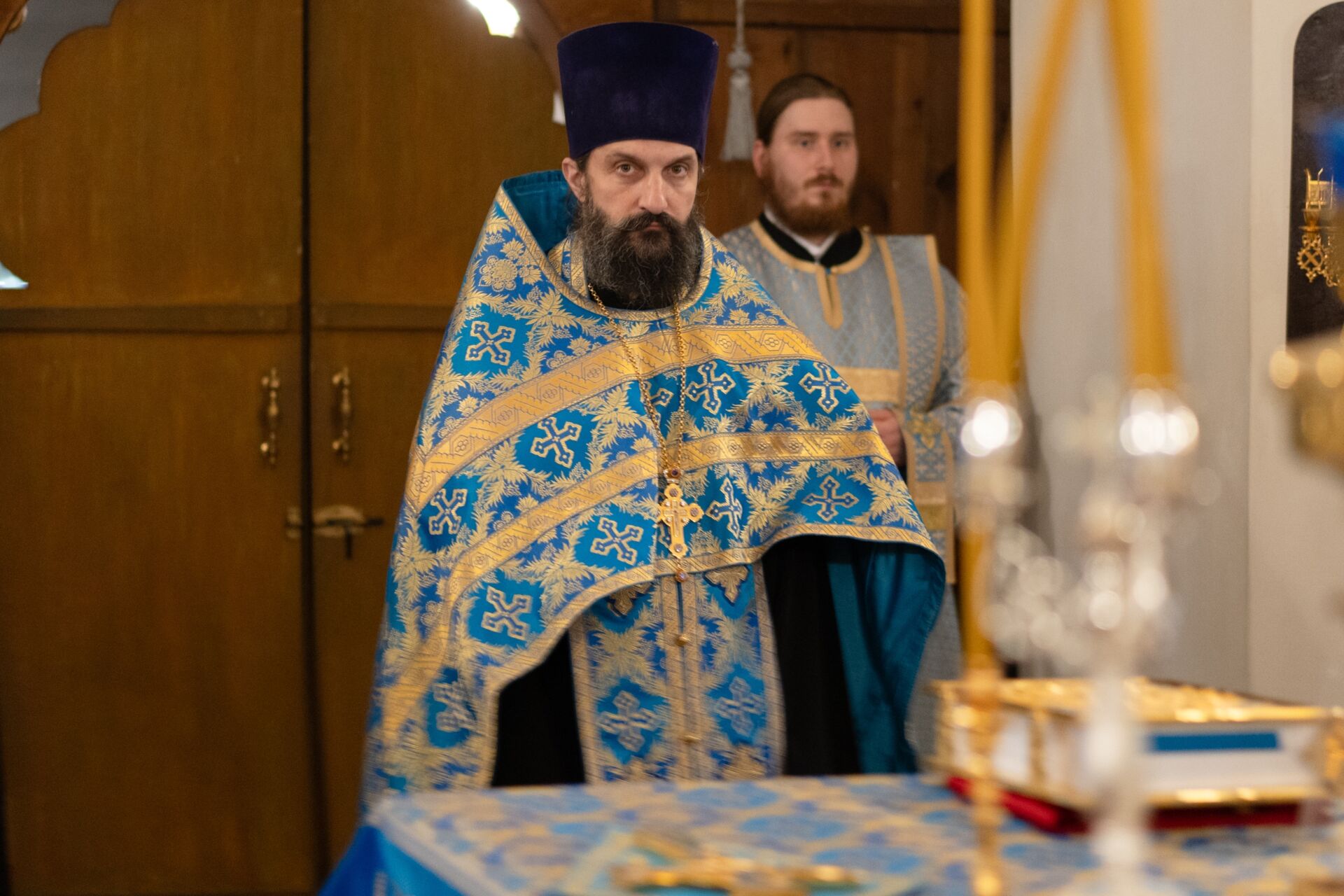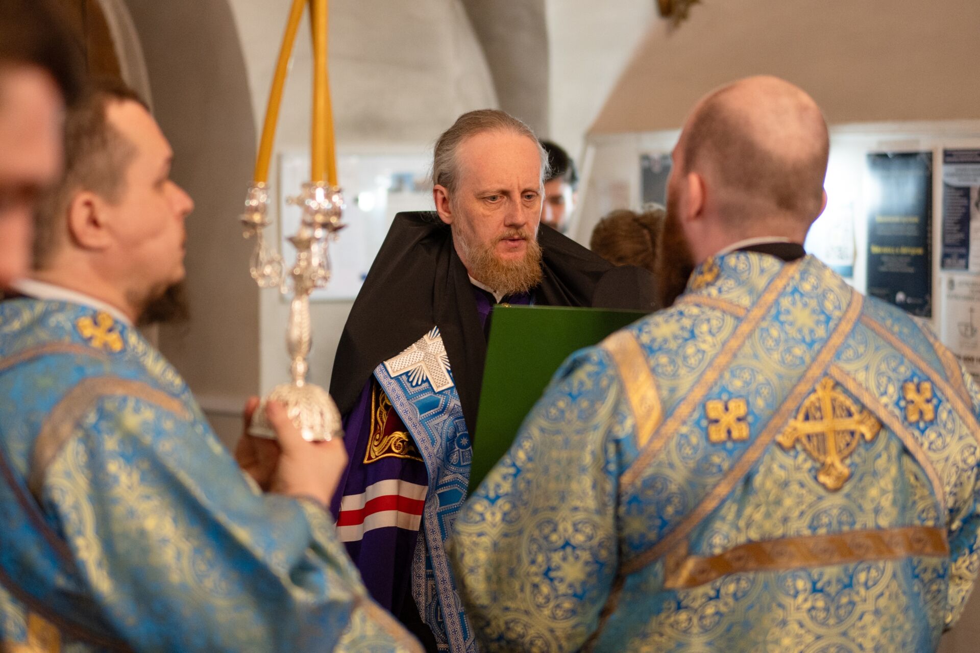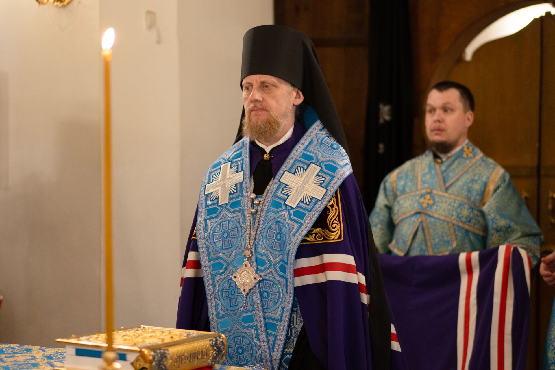 Его Преосвященству сослужили: почётный настоятель собора протоиерей Андрей Кульков, настоятель собора протоиерей Алексей Морозов, священник Алексей Талалаев, диакон Алексей Герасимов, диакон Сергий Танчинец, диакон Даниил Булычев.