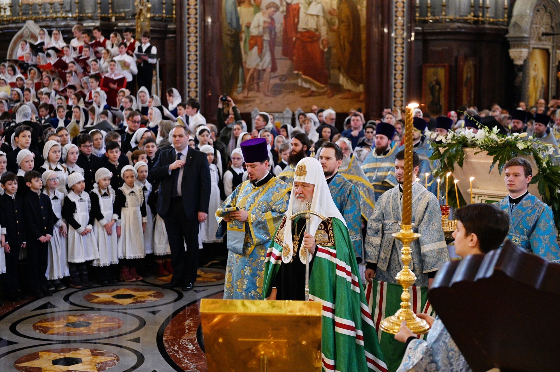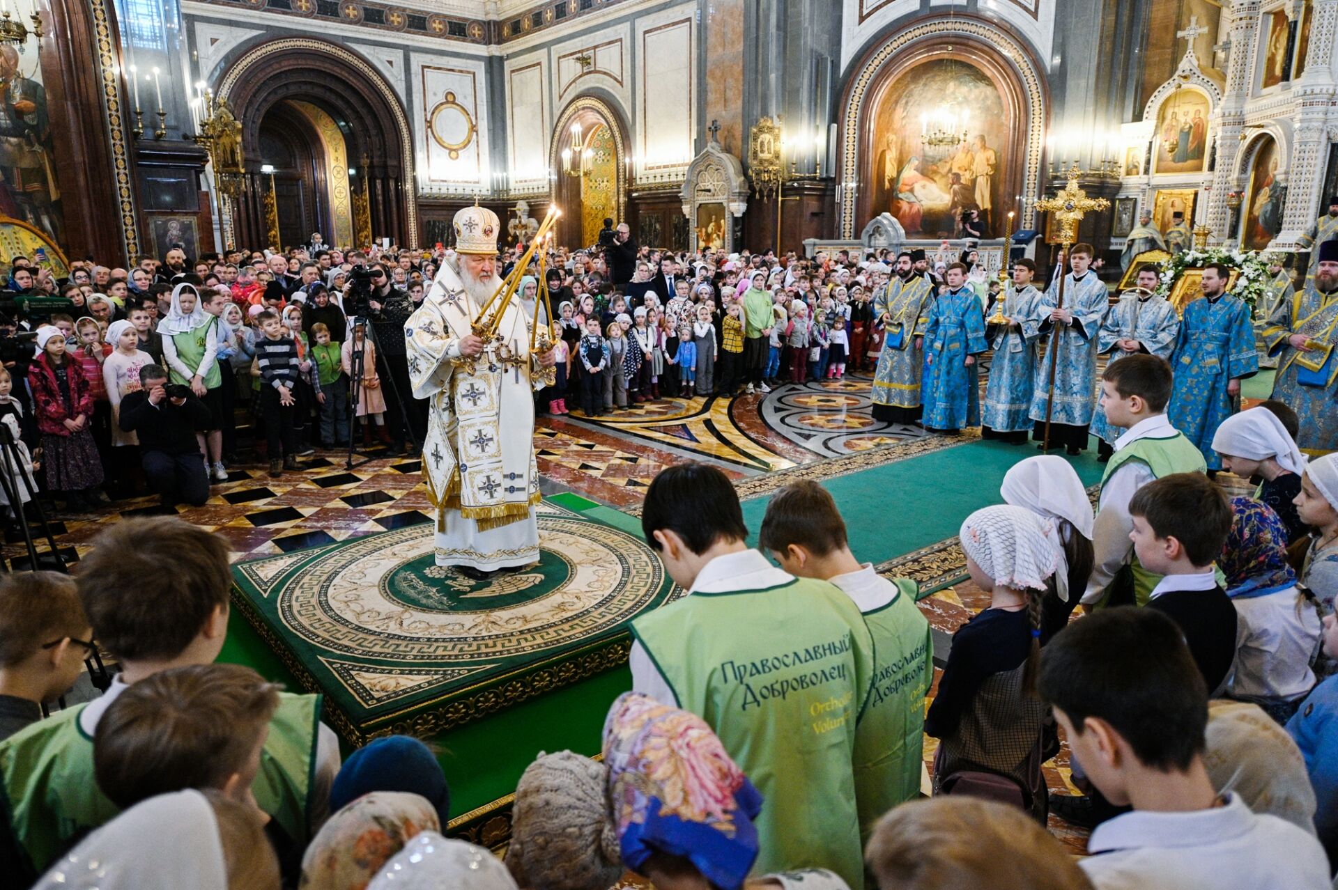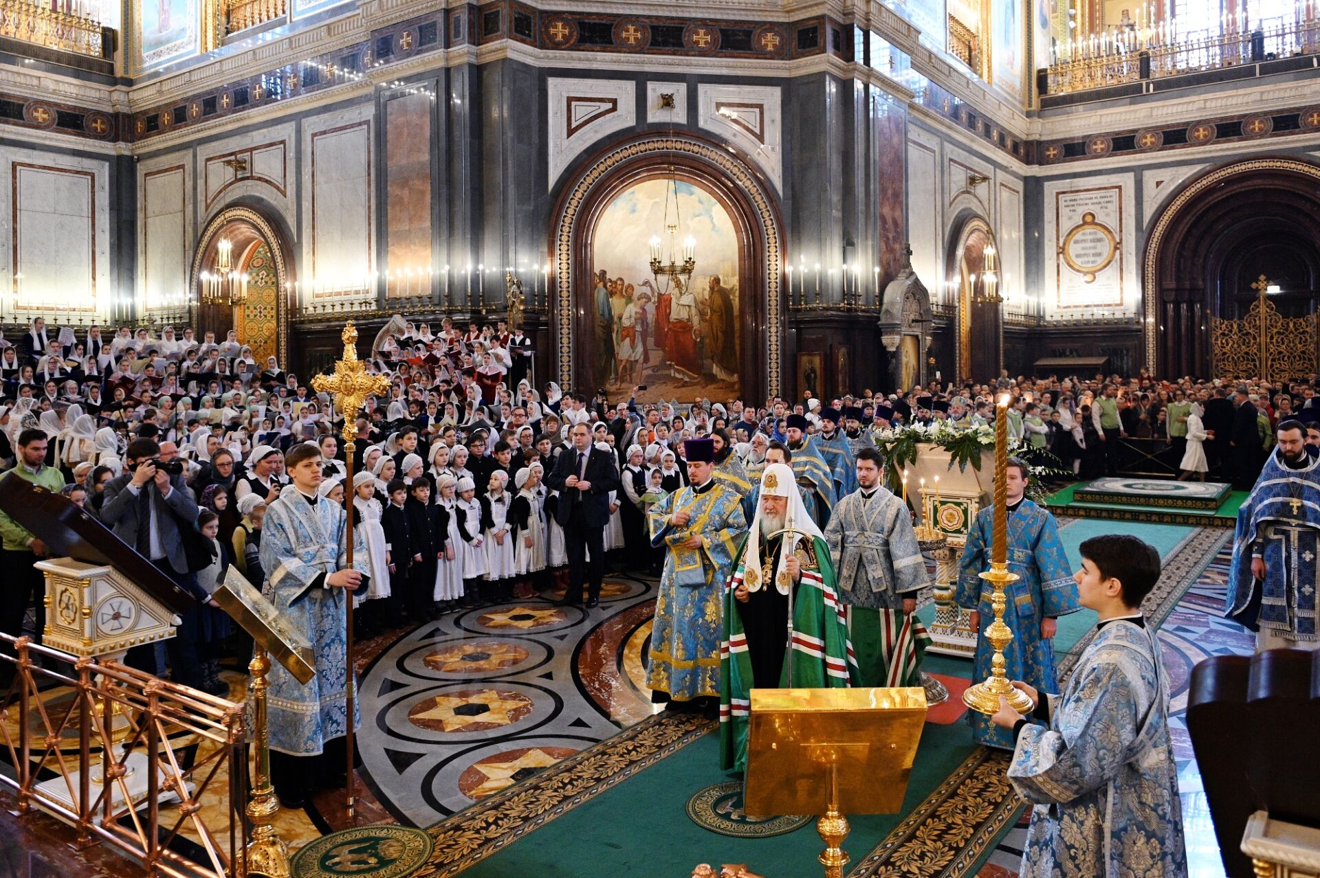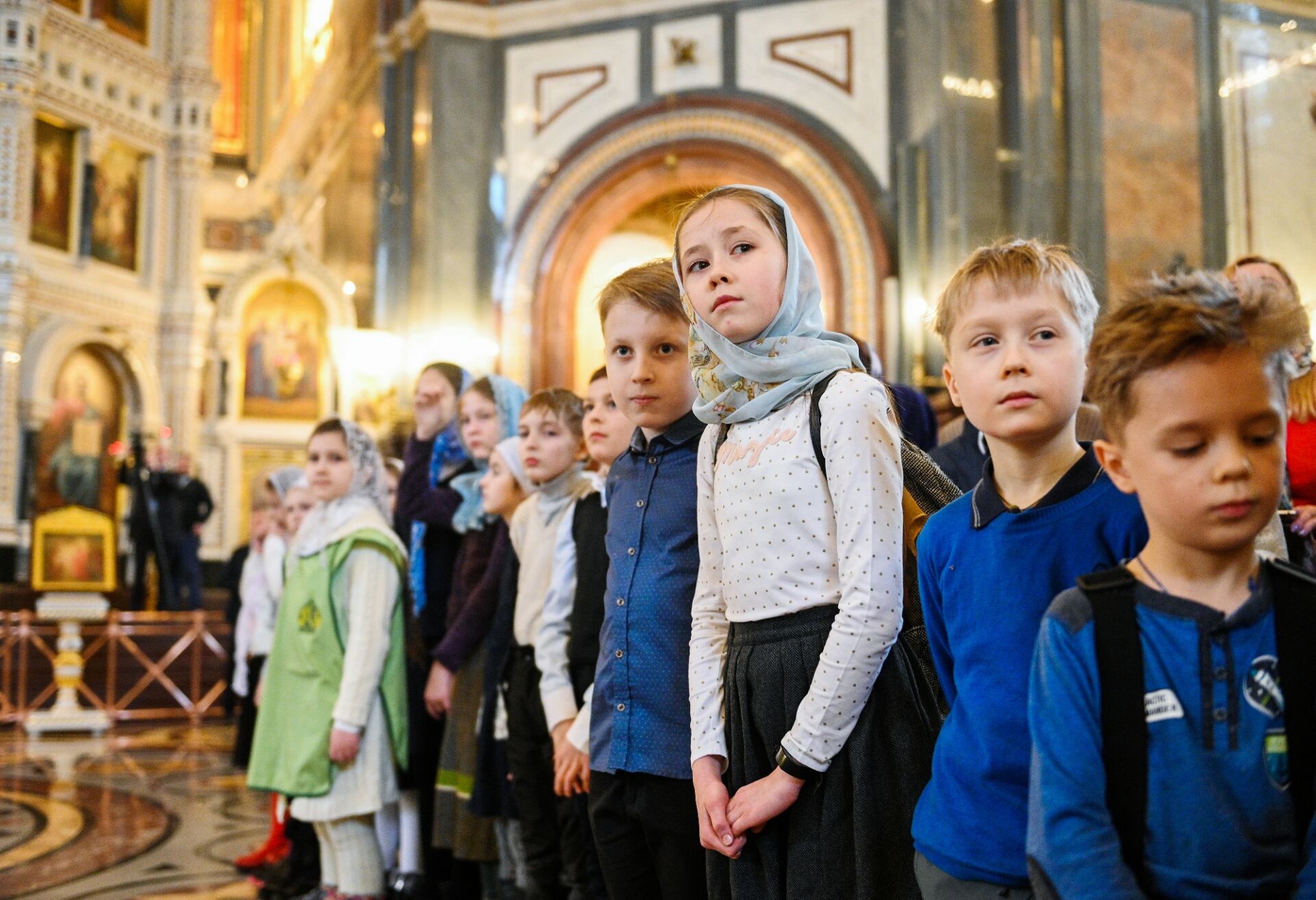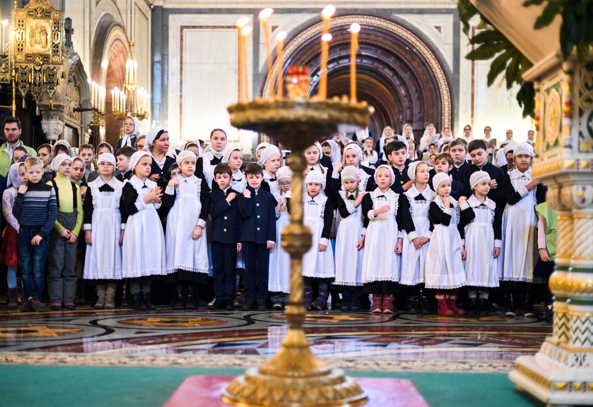 За Литургией молились учащиеся православных гимназий и воскресных школ российской столицы, дети из многодетных семей священнослужителей и мирян и их родители. Все песнопения исполнил сводный детский хор под управлением Варвары Волковой.