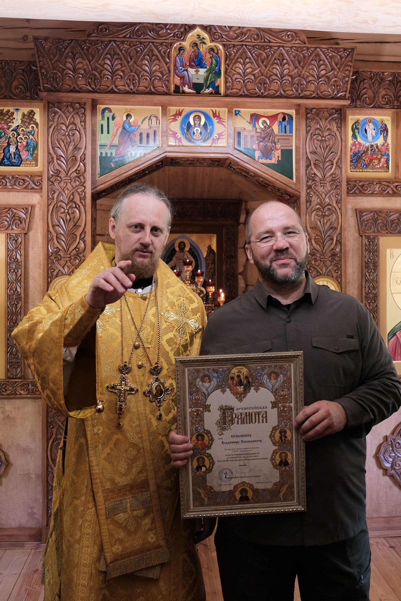 В благословение и благодарность за понесённые труды на благо Святой Церкви в Переславской епархии ктитор храма Владимир Николаевич Ермошин был удостоен архиерейской грамоты.