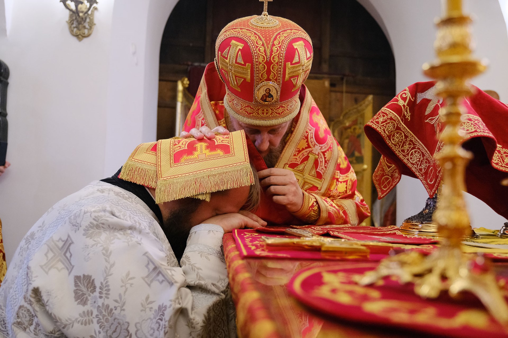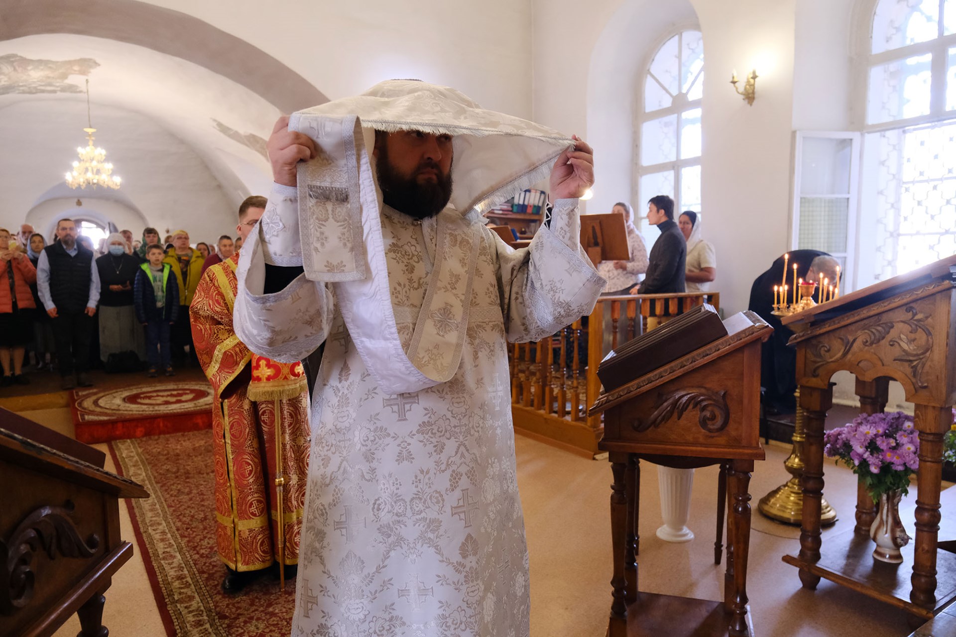 После перенесения Святых Даров владыка совершил священническую хиротонию диакона Андрея Синицына, клирика храма Смоленской иконы Божией Матери села Ям.