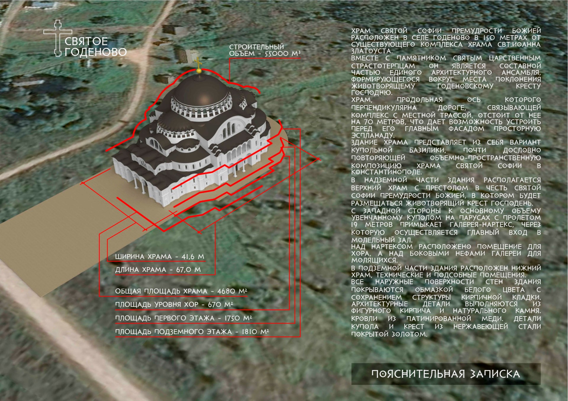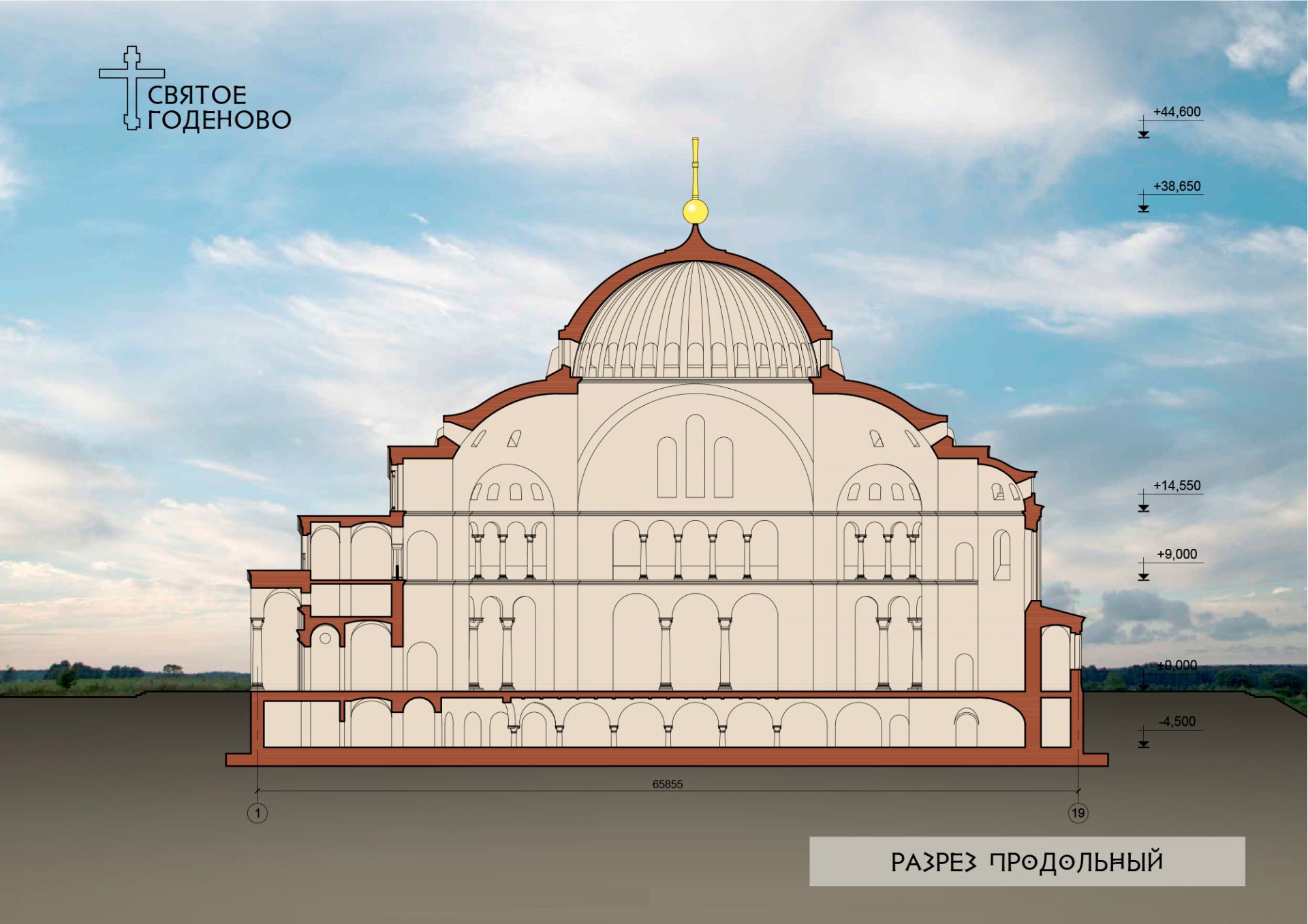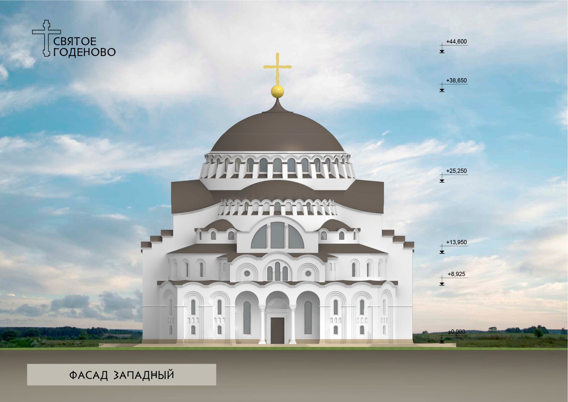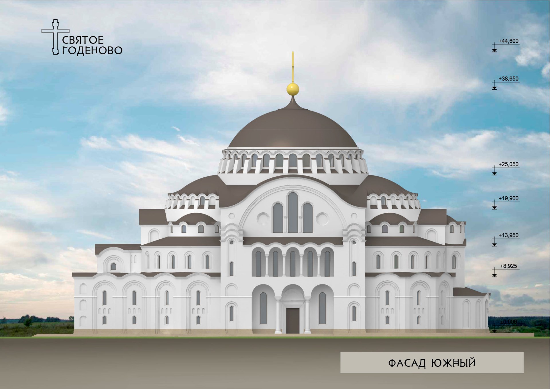 Алексей Анатольевич проникся нашими идеями и творчески подошёл к процессу проектирования. Наш храм уменьшен относительно оригинала в пропорциях золотого сечения, то есть примерно в полтора раза. Кроме того, в размерах храма учтены размеры Годеновского Креста: ширина купола ровно в десть раз больше ширины креста — 19,5 метров.
