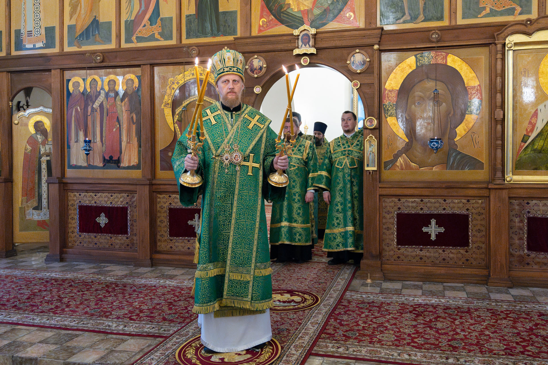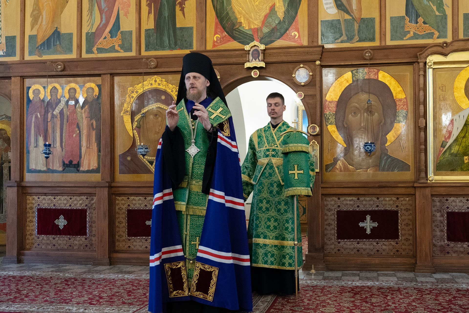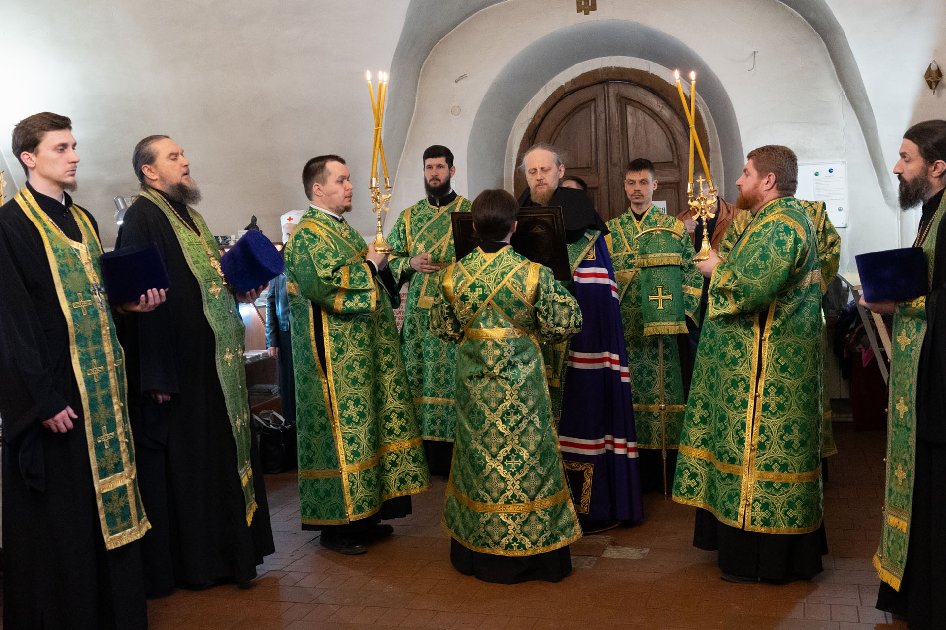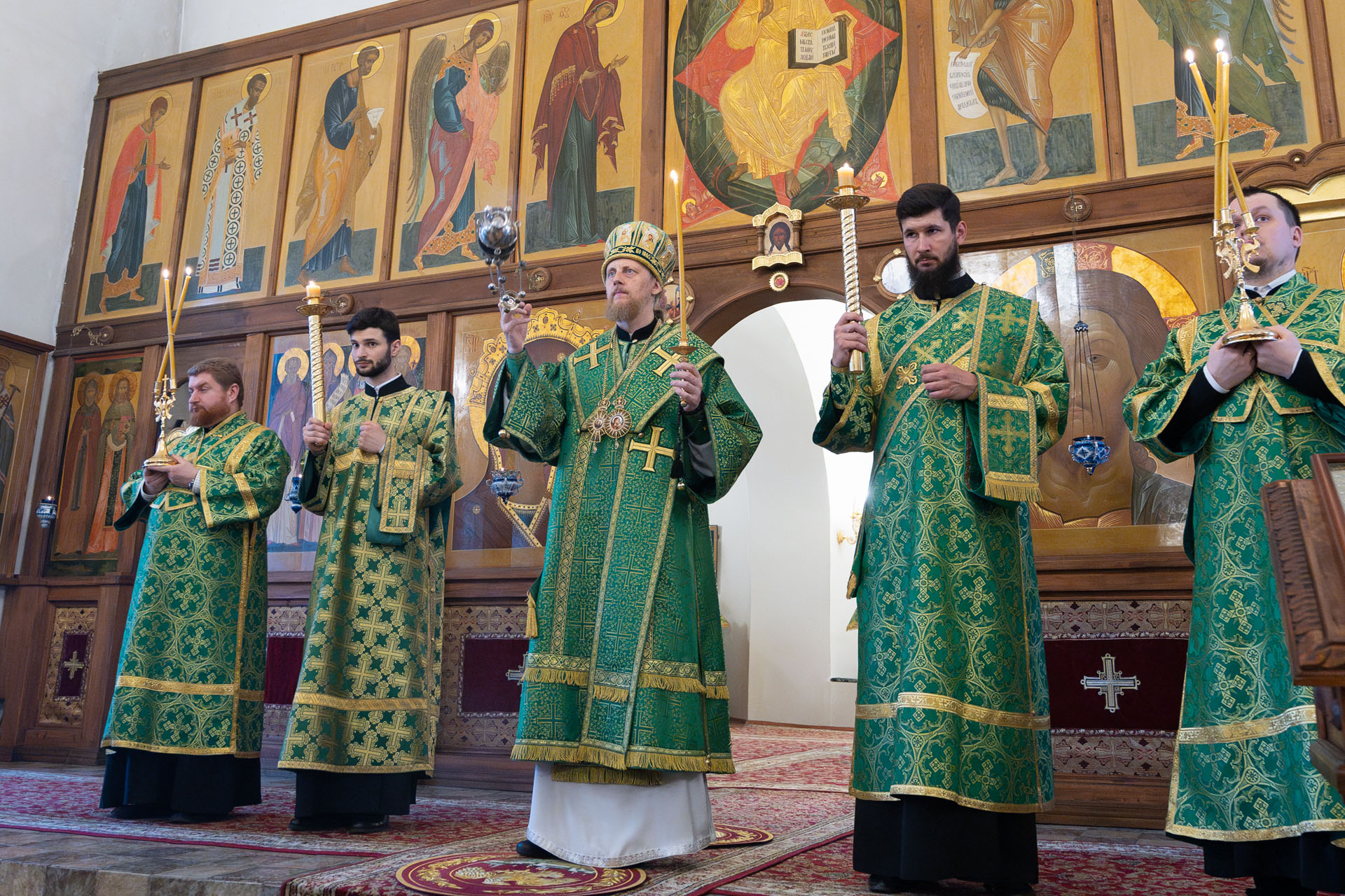 Его Преосвященству сослужили: почётный настоятель собора протоиерей Андрей Кульков, настоятель собора протоиерей Алексей Морозов, священник Алексей Талалаев, диакон Алексей Герасимов, диакон Сергий Танчинец.